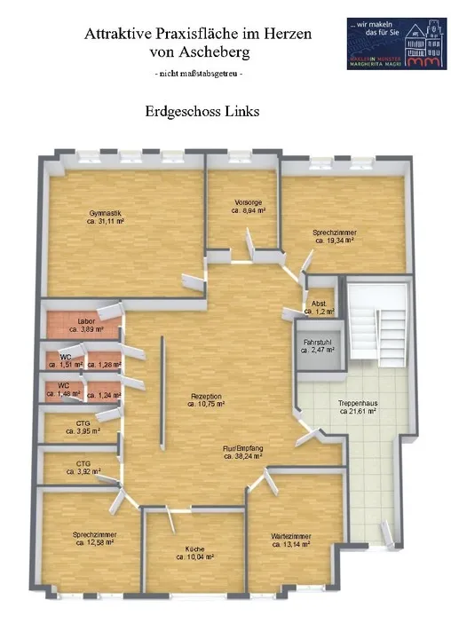 Diese Praxis befindet sich im Erdgeschoss in einem 13-Parteienhaus im Herzen von Ascheberg. Das Gebäude wurde im Jahre 1999 in Massivbauweise errichtet und wurde fortlaufend gut gepflegt.