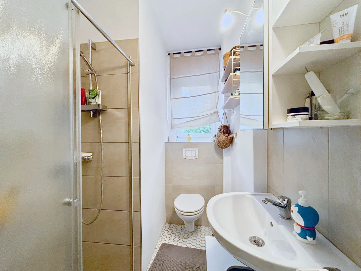 Das Bad verfügt über eine bodentiefe Dusche, ein Waschbecken und ein WC.