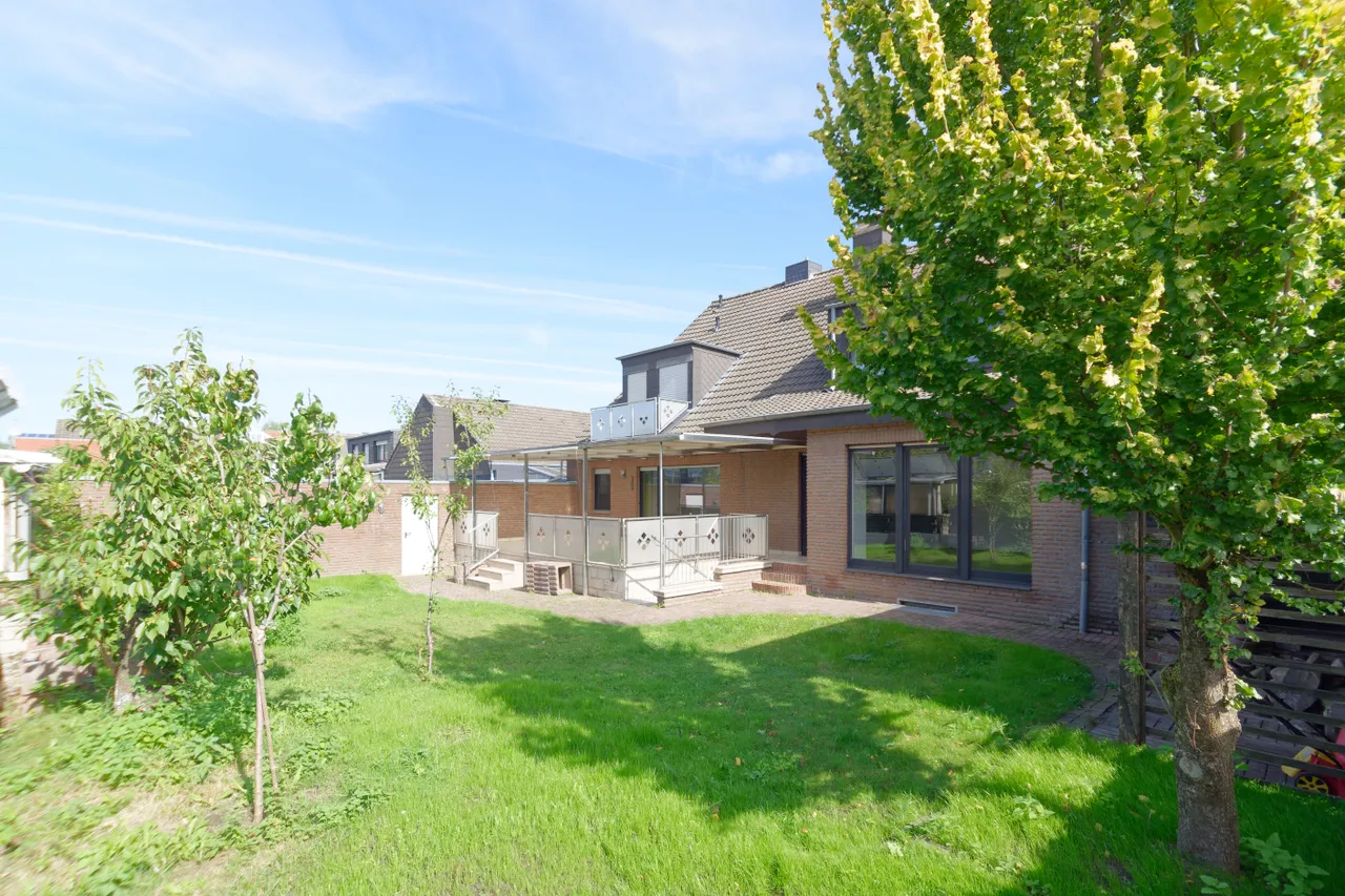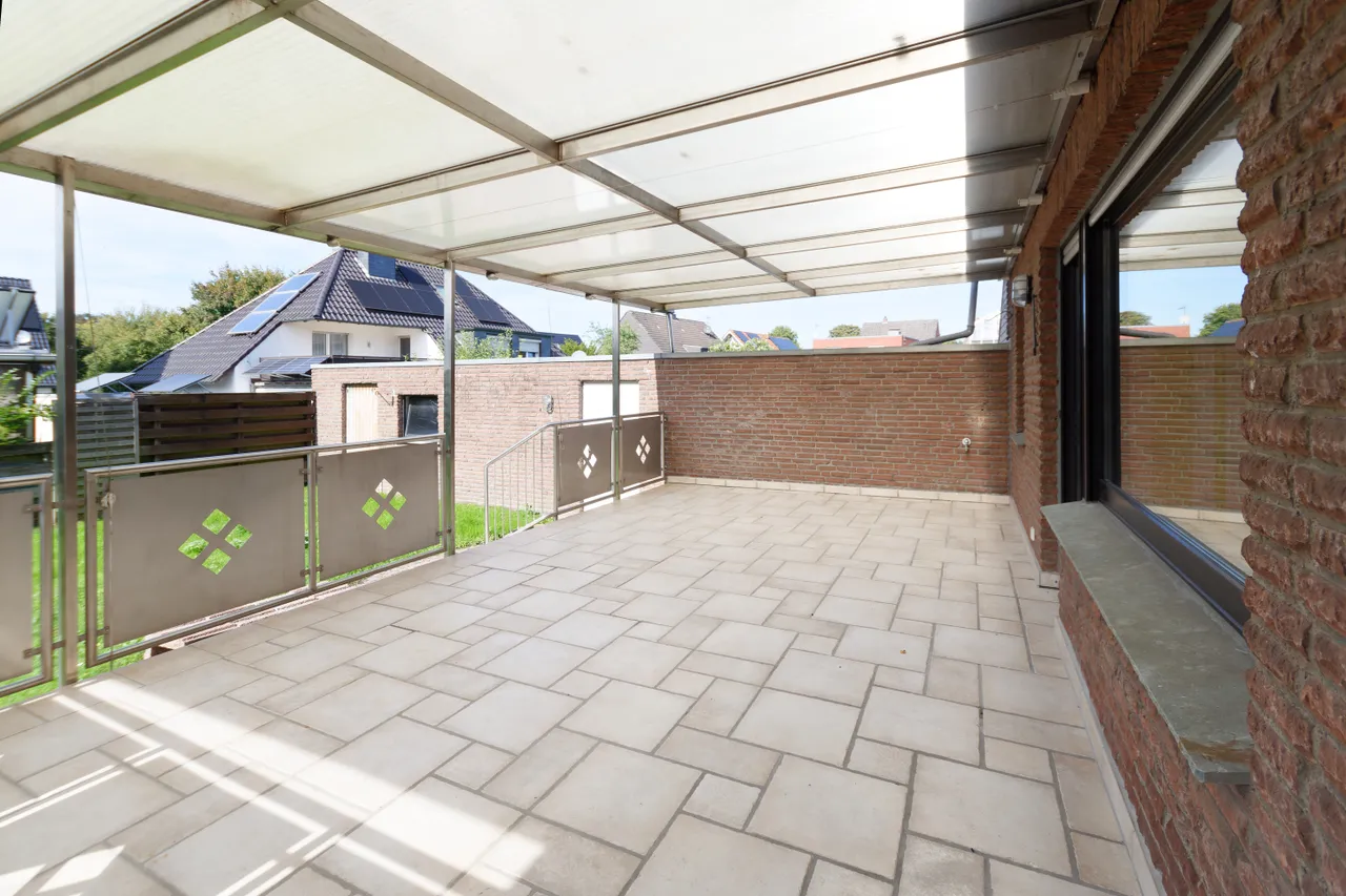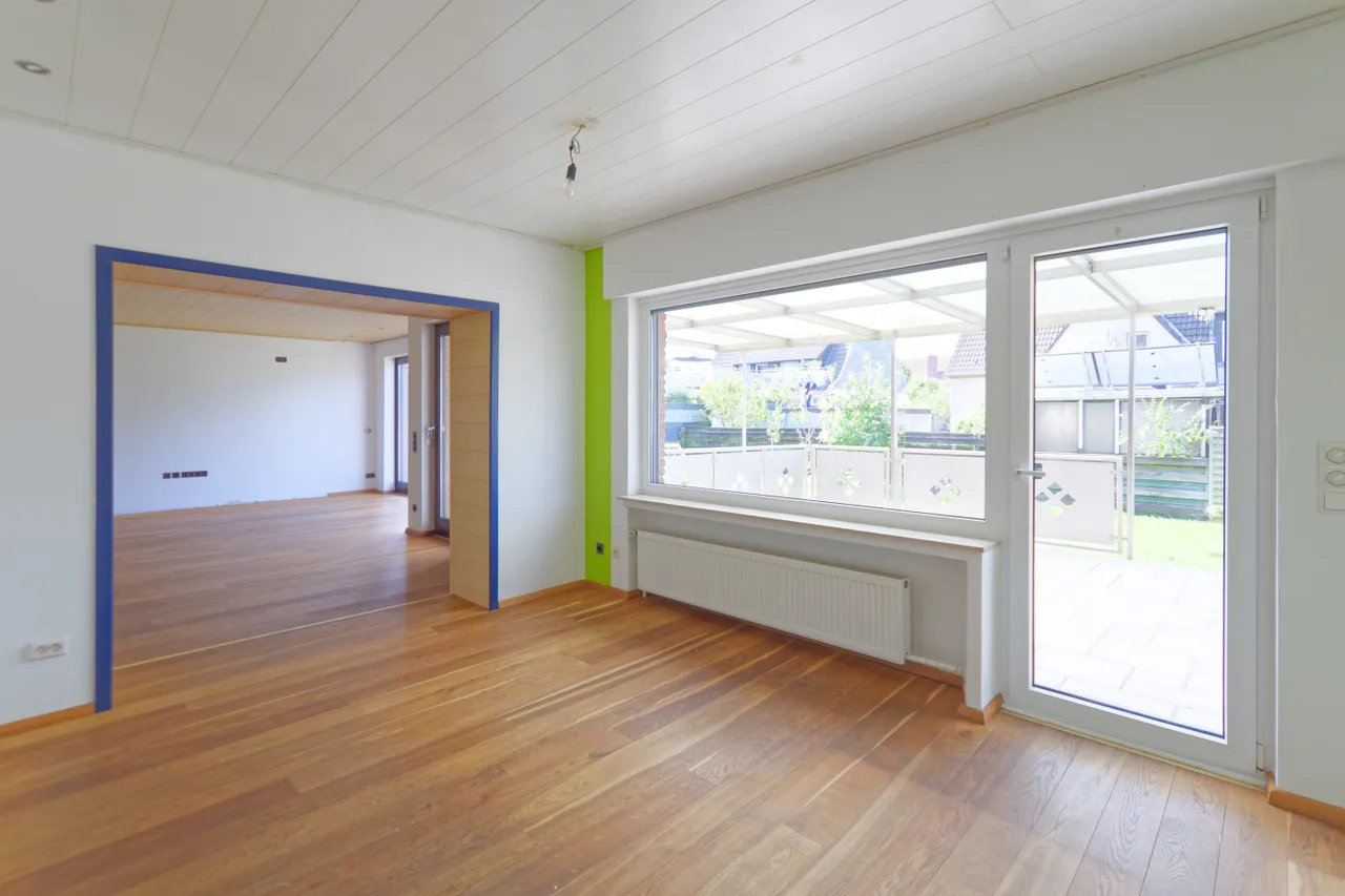 Über den Hauseingang gelangen Sie in den Flur mit Platz für eine Garderobe. Rechte Hand befindet sich ein modernes Gäste-WC. Weiter den Flur entlang liegen rechts das Esszimmer und das großzügige Wohnzimmer, welche mit Holzdielen als Fußboden ausgestattet sind. Im Wohnzimmer ist eine Fußbodenheizung verlegt. Zudem steht hier ein stillgelegter Kachelofen. Der Kamin ist zweizügig ausgelegt. Die Räume bestechen durch große Fensterfronten und verglaste Terrassentüren, die zum Garten ausgerichtet sind. Auf dieser Seite sind ebenfalls die Küche und ein angrenzender Hauswirtschaftsraum angeordnet. Vom Wohn- und Esszimmer aus betreten Sie die überdachte Terrasse mit ca. 28 m² Nutzfläche. Diese Haushälfte beansprucht den gesamten Garten. Somit ergibt sich eine Gartenfläche von ca. 130 m². Zudem wurde die Garage als Doppelgarage konzipiert. Im hinteren Teil der Garage ist ein abgetrennter Geräteraum. Das Rolltor wird elektrisch betrieben.