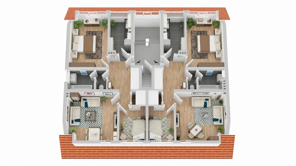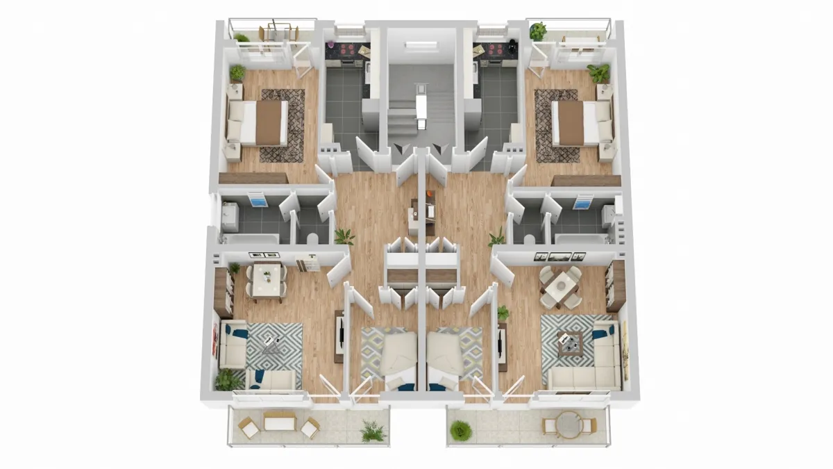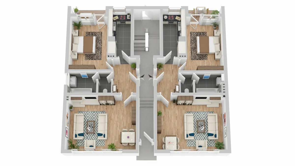 Im Erdgeschoss befinden sich zwei attraktive Zwei-Zimmer-Wohnungen, die beiden oberen Etagen beherbergen jeweils zwei großzügige Drei-Zimmer-Wohnungen. Im Dachgeschoss liegen zwei weitere Drei-Zimmer-Wohnungen. Alle Wohnungen, mit Ausnahme der Dachgeschosswohnungen, verfügen über einen Balkon. Die Einheiten im 1. und 2. Obergeschoss verfügen sogar über zwei Balkone und bieten damit besonders hohen Wohnkomfort.