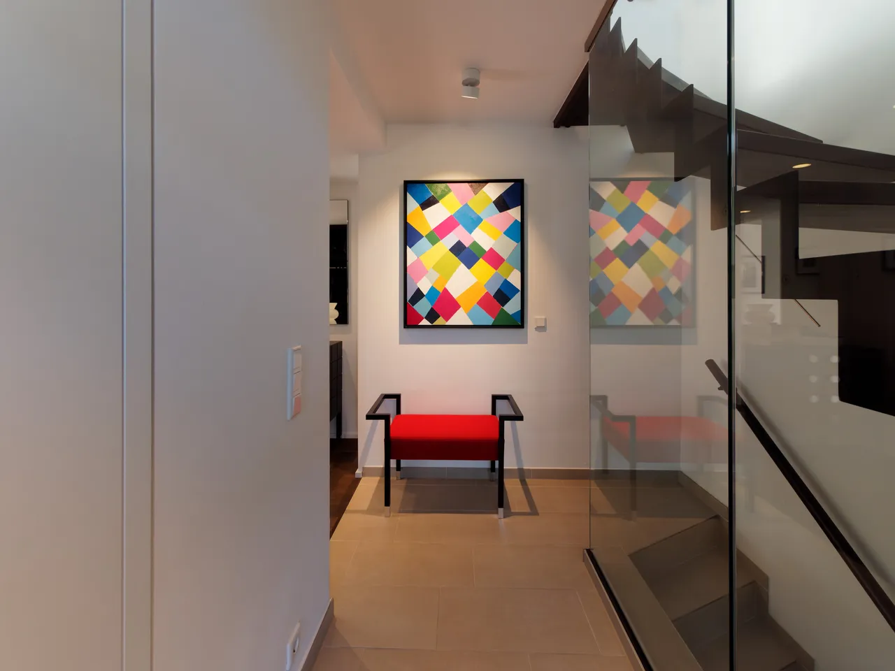 Die Fassade wurde in seiner Grundstruktur erhalten, komplett überarbeitet und erhielt einen stylischen Eingangsbereich. Dieser setzt sich drinnen auf der rechten Seite mit einer völlig neu gestalteten Treppenanlage, dicken Eichenholzstufen und Glaswandabtrennung fort. Links befinden sich das neu gestaltete Gäste-WC und eine eingebaute Garderobe.
