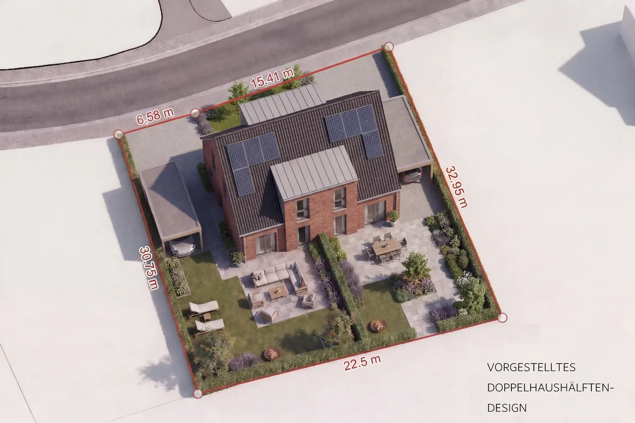 Für das Grundstück liegt eine beispielhafte Planung zur Bebauung mit einem Doppelhaus vor. Optional kann der Generalunternehmer mit dem Bau der vorliegenden Planung beauftragt werden.