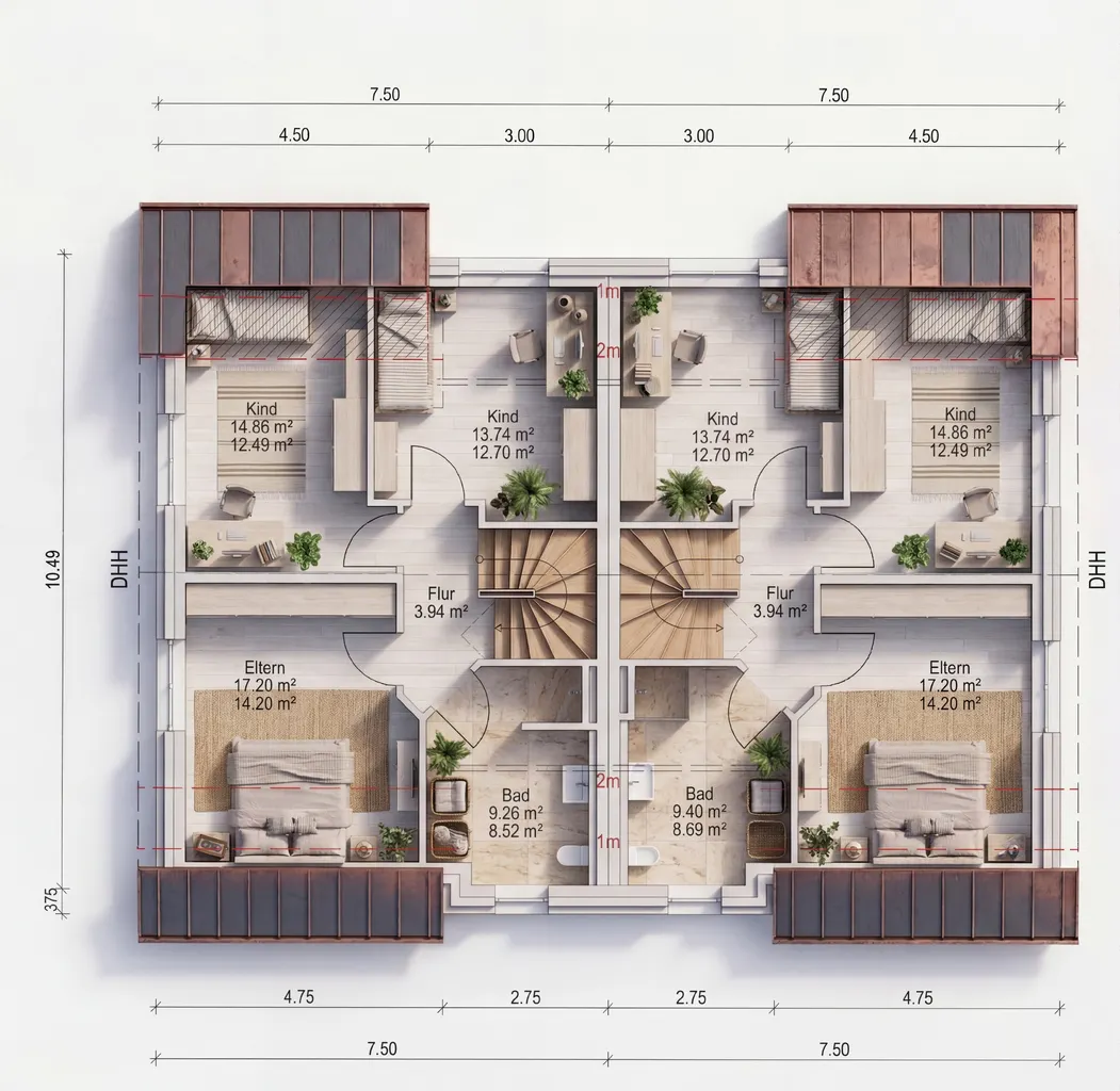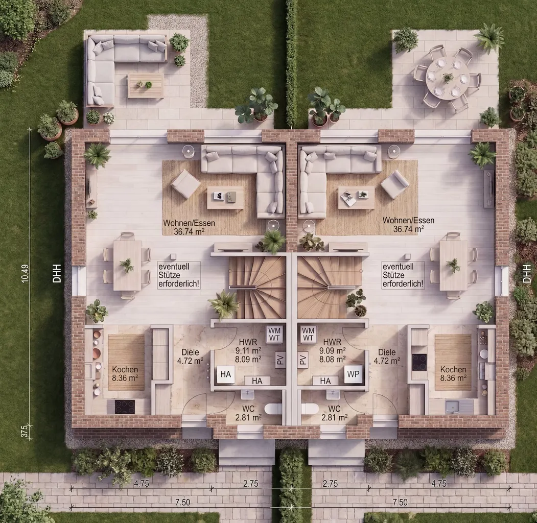 • Vorliegende Doppelhaus-Planung optional umsetzbar