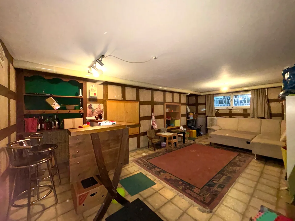 Ein besonderes Plus ist der Vollkeller, der nicht nur reichlich Stauraum bereithält, sondern auch mit einem gemütlichen Partyraum punktet. Darüber hinaus steht im Keller ein weiterer Gästeraum zur Verfügung – ideal für Besucher oder als zusätzliches Hobbyzimmer. Die Ölheizung wurde 2015 erneuert und sorgt für eine zuverlässige Wärmeversorgung.