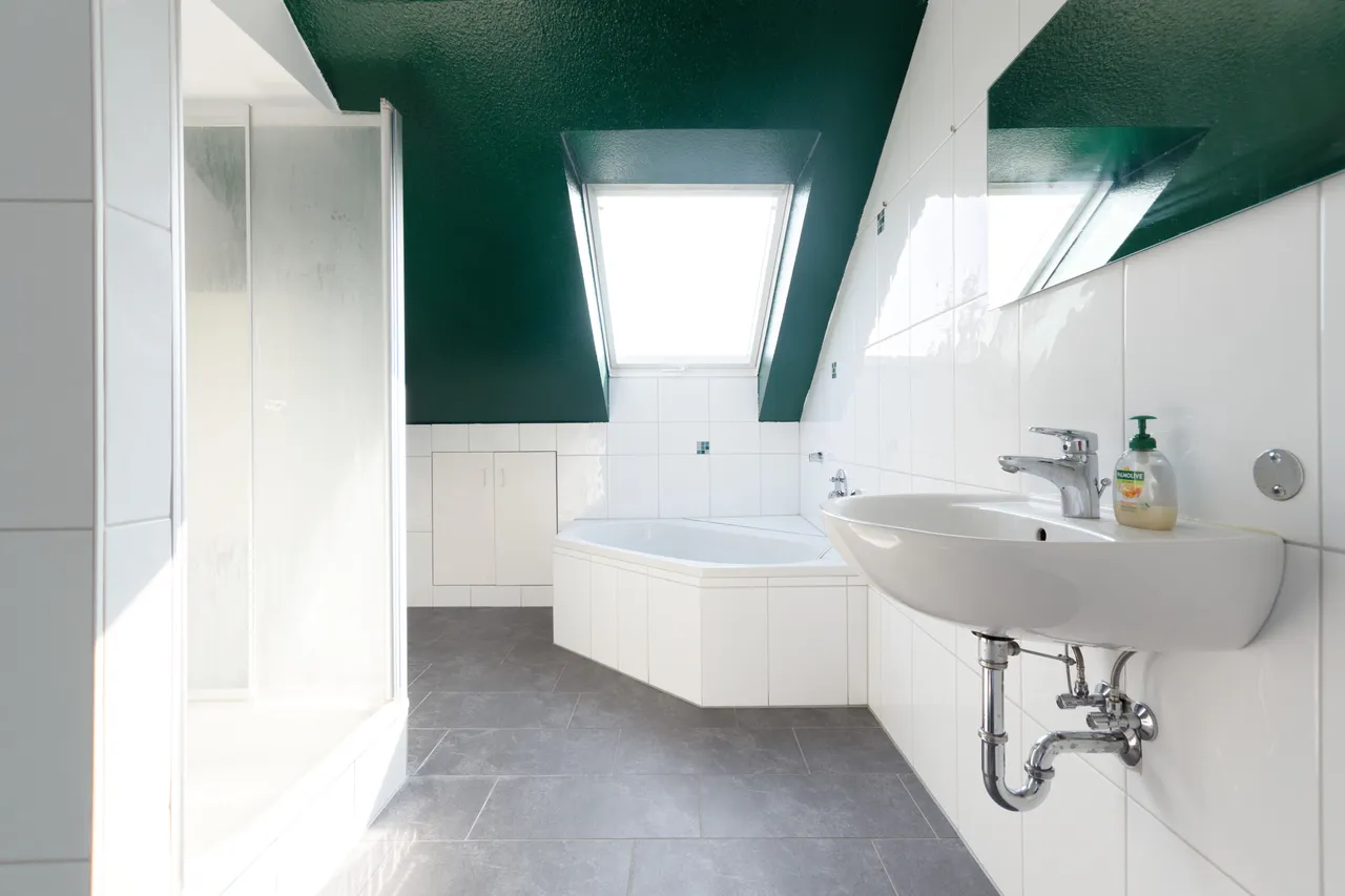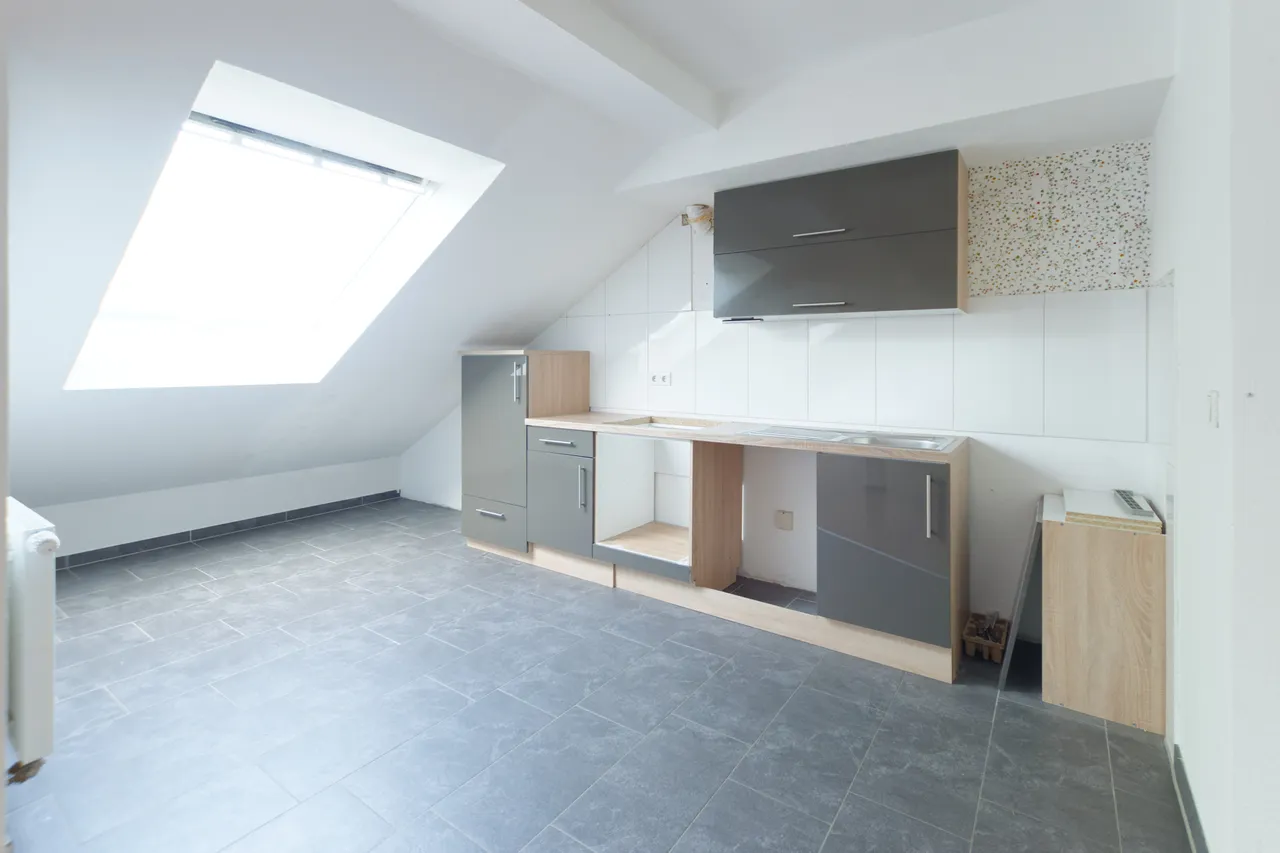 Das Wohn- und das Schlafzimmer sind mit einem Bodenbelag in Holzoptik ausgestattet. Der Eingangsbereich, die Küche und das Badezimmer verfügen über Fliesenböden. Die großen Dachfenster lassen viel Tagelicht in die Wohnung. Beheizt wird die Wohnung über eine Etagenheizung, welche im Badezimmer installiert ist.