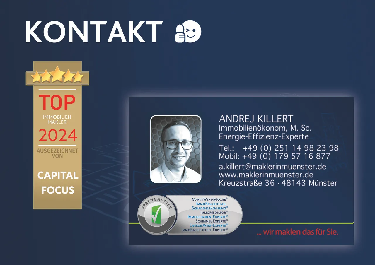 Fotos und Grafiken unterliegen dem Copyright der Firma Maklerin Münster. Bezüglich der Objektdaten ist die Firma Maklerin Münster auf die Auskünfte der Verkäufer / Vermieter, Bauträger, oder der Behörden angewiesen. Für die Vollständigkeit und Richtigkeit kann daher keine Haftung übernommen werden. Schadensersatzansprüche sind aus diesen Gründen uns gegenüber ausgeschlossen. Irrtum bleibt ausdrücklich vorbehalten.