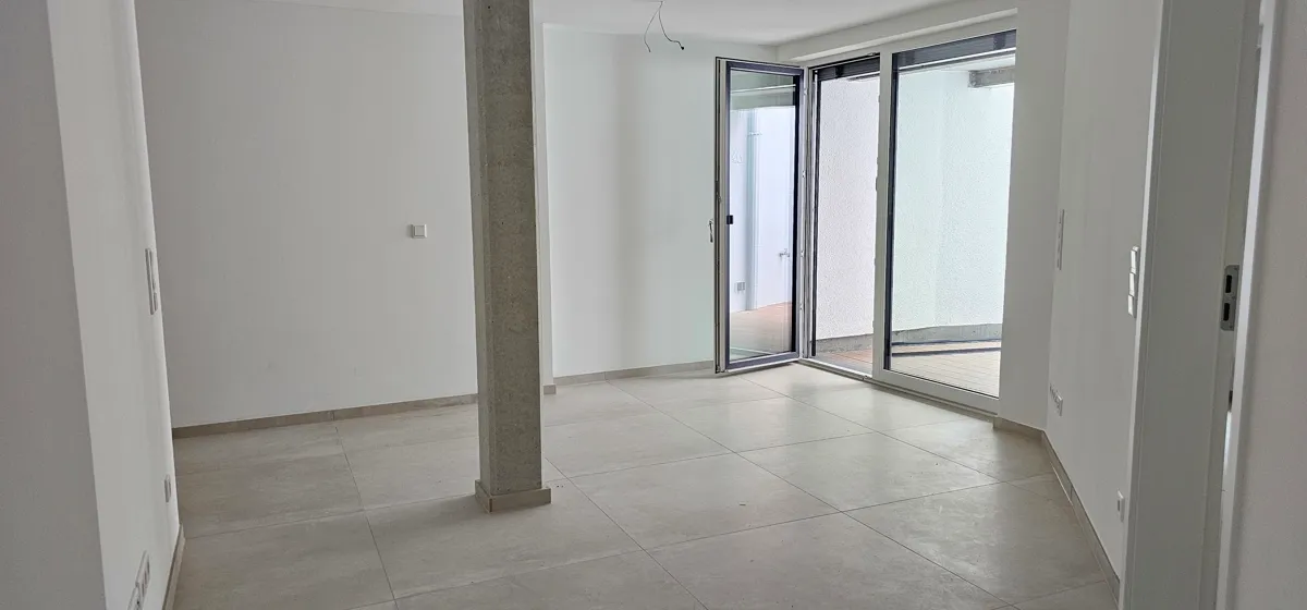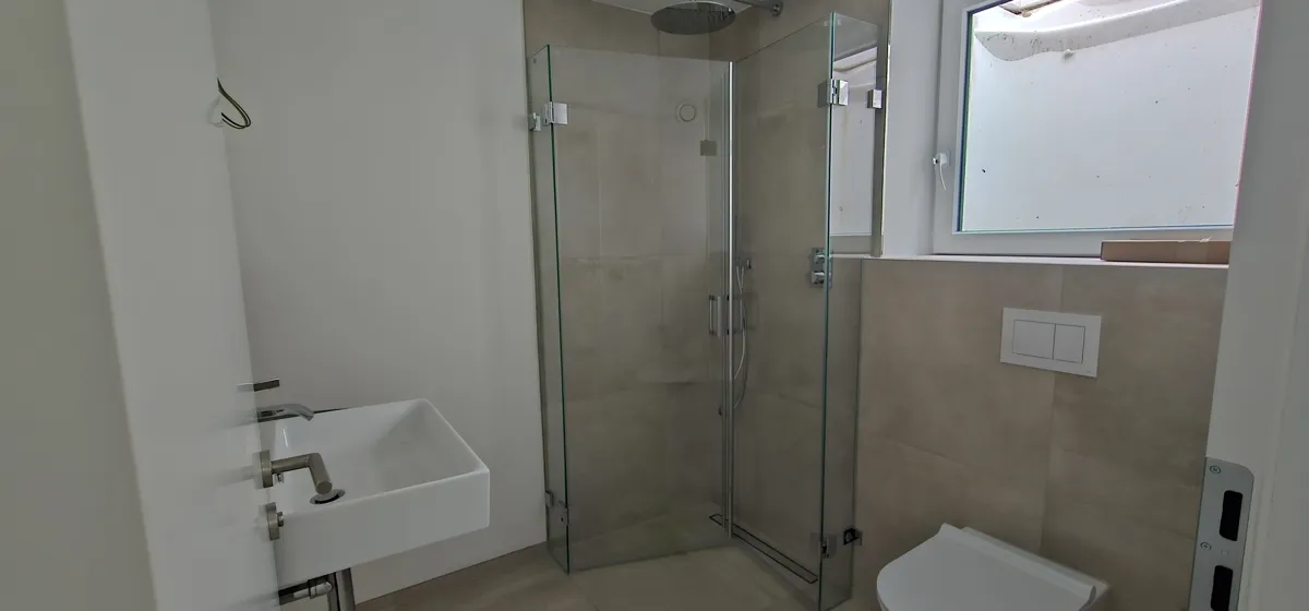 Der private Hauseingang führt Sie direkt in den einladenden Eingangsbereich mit praktischer Garderobennische sowie einem modernen Gäste-WC. Herzstück der Wohnung ist der offene Wohn-, Ess- und Kochbereich mit bodentiefen Fenstern, die für eine helle, freundliche Atmosphäre sorgen. Von hier aus gelangen Sie auf die gemütliche, nach Osten ausgerichtete Loggia – der perfekte Ort für ein sonniges Frühstück oder entspannte Stunden im Freien.