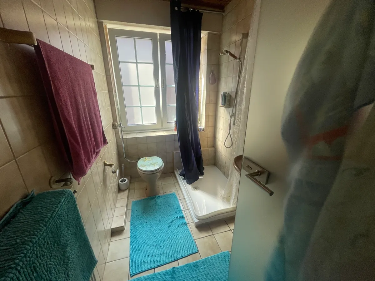Über einen Seiteneingang gelangt man ins Obergeschoss, wo sich eine geräumige Wohnung mit insgesamt 7 Zimmern, einer Küche, Diele, Bad, WC und einer rund 40 m² großen Dachterrasse befindet. Zusätzlich gehören ein ca. 20 m² großer Bodenraum sowie Kellerräume zur Wohnung. Die Kaltmiete für die Wohnung beträgt aktuell 950 € monatlich.