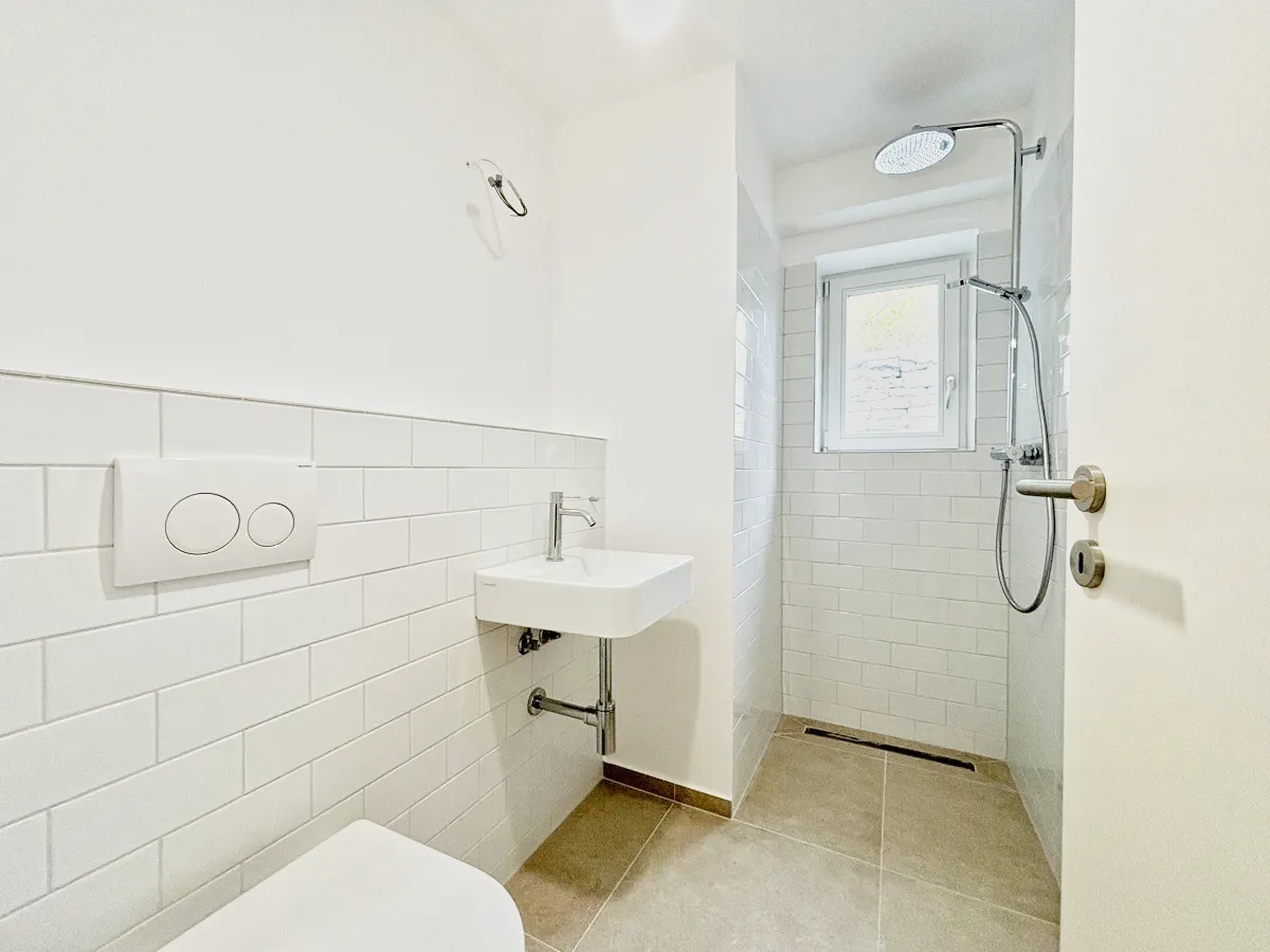 Das Badezimmer besticht durch durch seine zeitgemäße Ausstattung mit hellen Feinsteinbodenfliesen und dazu passenden weißen Wandfliesen. Es verfügt neben einem Waschbecken und WC auch über eine bodentiefe Dusche.