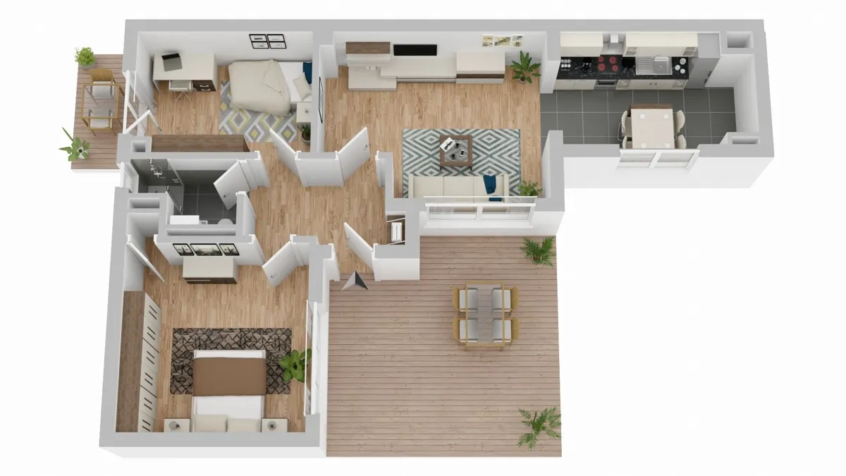 Eine großzügige Terrasse von ca. 15 m², die vor dem Wohn- und Schlafraum verläuft, lädt zu gemütlichen Stunden im Freien ein. Eine weitere kleine Terrasse schließt sich dem Arbeits-/ oder Gästezimmer an und ist von diesem aus zugänglich.