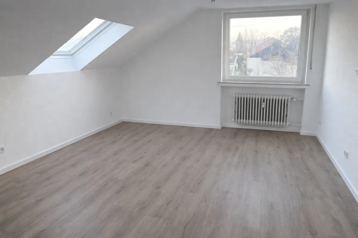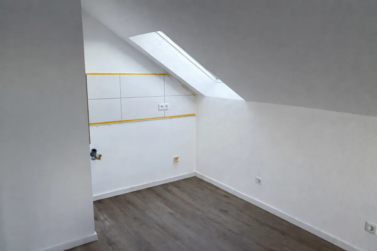 Erstbezug nach Sanierung! Diese gemütliche Dachgeschoss Wohnung liegt im 2. Obergeschoss eines kleinen Mehrfamilienhauses. Der Ausbau des Dachgeschosses erfolgte 1981. Die Wohnung unterteilt sich in eine großzügige Wohnküche, ein Wohnzimmer und ein Schlafzimmer sowie ein Badezimmer. Ein praktischer Abstellraum und ein eigener Stellplatz komplettieren diese Wohnung. Der kleine Garten kann von allen Bewohnern des Hauses genutzt werden.