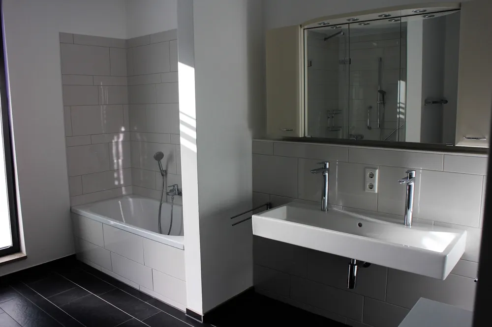 •Badezimmer mit bodentiefer Dusche, Badewanne und zwei Waschbecken