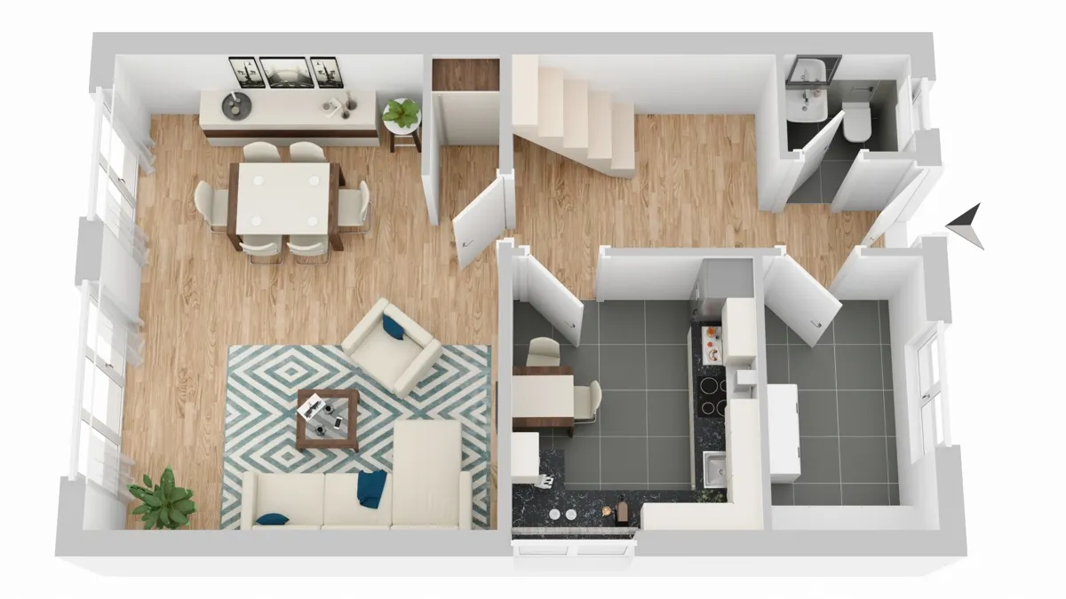 Erdgeschoss: Küche, Wohn-/Esszimmer, Hauswirtschaftsraum, Abstellraum, Gäste-WC