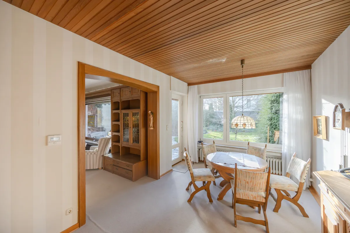 Im Erdgeschoss beeindruckt das Haus durch eine Deckenhöhe von ca. 2,8 Metern. Die Küche lässt sich durch das Entfernen einer kleinen Wand mühelos mit dem Esszimmer verbinden, sodass ein großzügiger Wohn- und Essbereich entsteht, der Familien viel Platz zum gemeinsamen Kochen, Essen und Beisammensein bietet. Das Wohnzimmer liegt direkt an Küche und Esszimmer an, sodass drei bisher getrennte Räume zu einem hellen, offenen Bereich verschmelzen. Die überdachte Terrasse ermöglicht einen direkten Blick nach draußen und schafft eine schöne Verbindung zum Garten, ideal für entspannte Nachmittage oder Spielstunden im Freien.