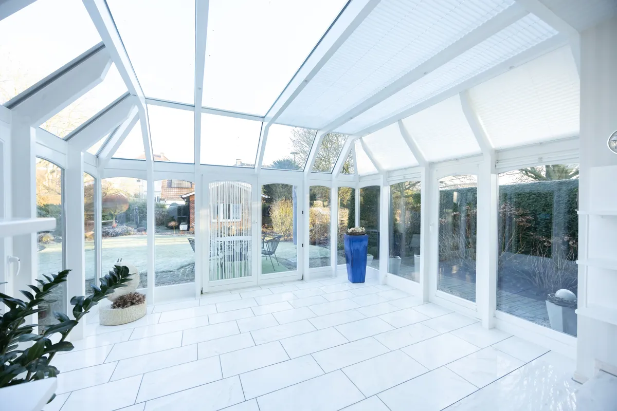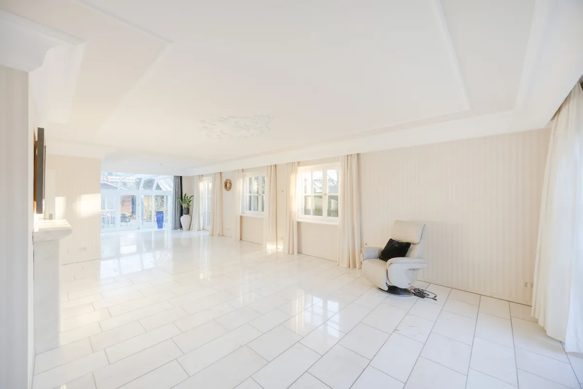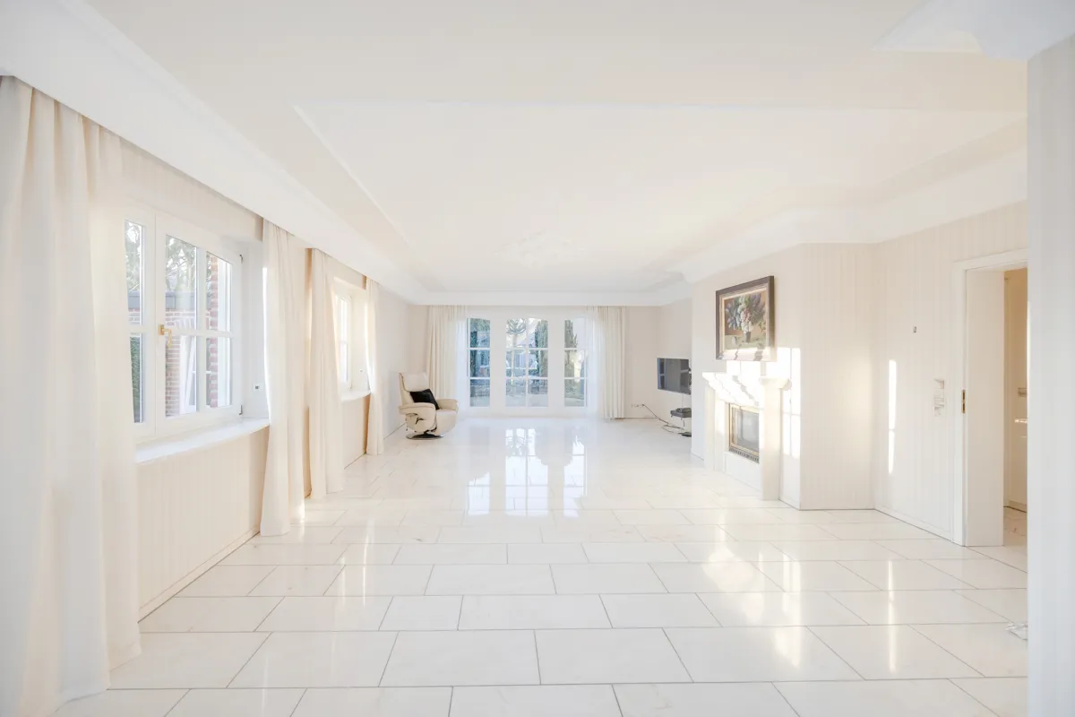 Mittelpunkt ist der helle Wohn- und Essbereich mit edlem Marmorboden und gemütlichem Kamin, der dem Haus eine stilvolle, warme Atmosphäre verleiht.