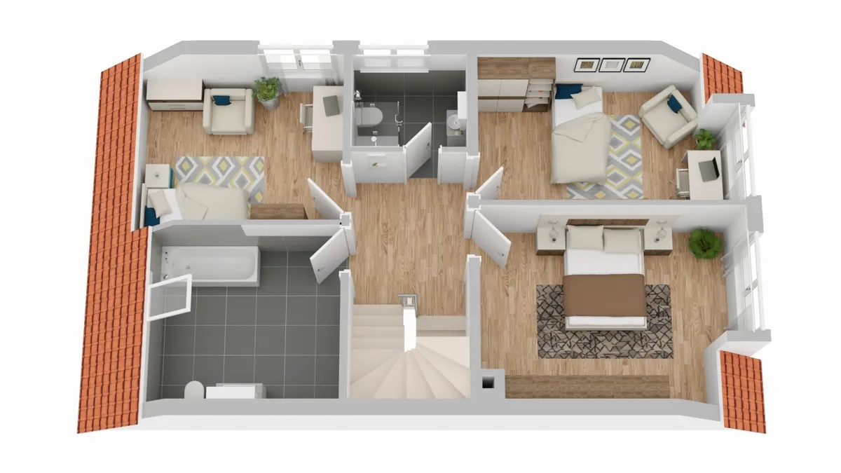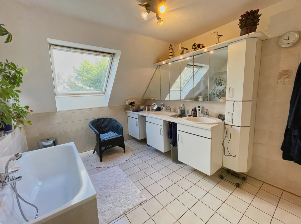 Über die Diele führt das Mahagoni-Treppenhaus ins Dachgeschoss, das drei Schlafzimmer sowie zwei Bäder beherbergt und damit genügend Platz für Familie oder Gäste bietet. Der Spitzboden ist ebenfalls über das Treppenhaus zugänglich, wohnlich ausgebaut und bietet zusätzliche Nutzfläche.