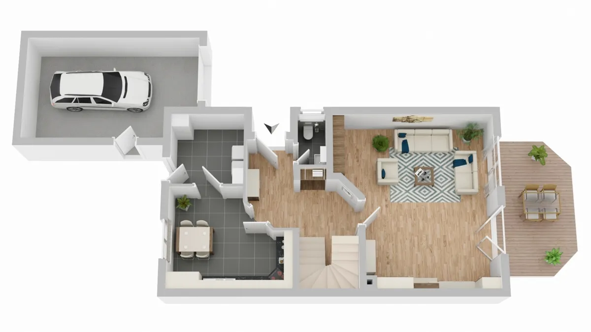 Im Erdgeschoss befinden sich der Eingangsbereich mit Zugang zum Gäste-WC, die Küche mit angrenzendem Hauswirtschaftsraum sowie das großzügige Wohnzimmer mit gemütlichem Kamin und direktem Zugang zur begrünten Terrasse – ideal für entspannte Stunden im Freien.