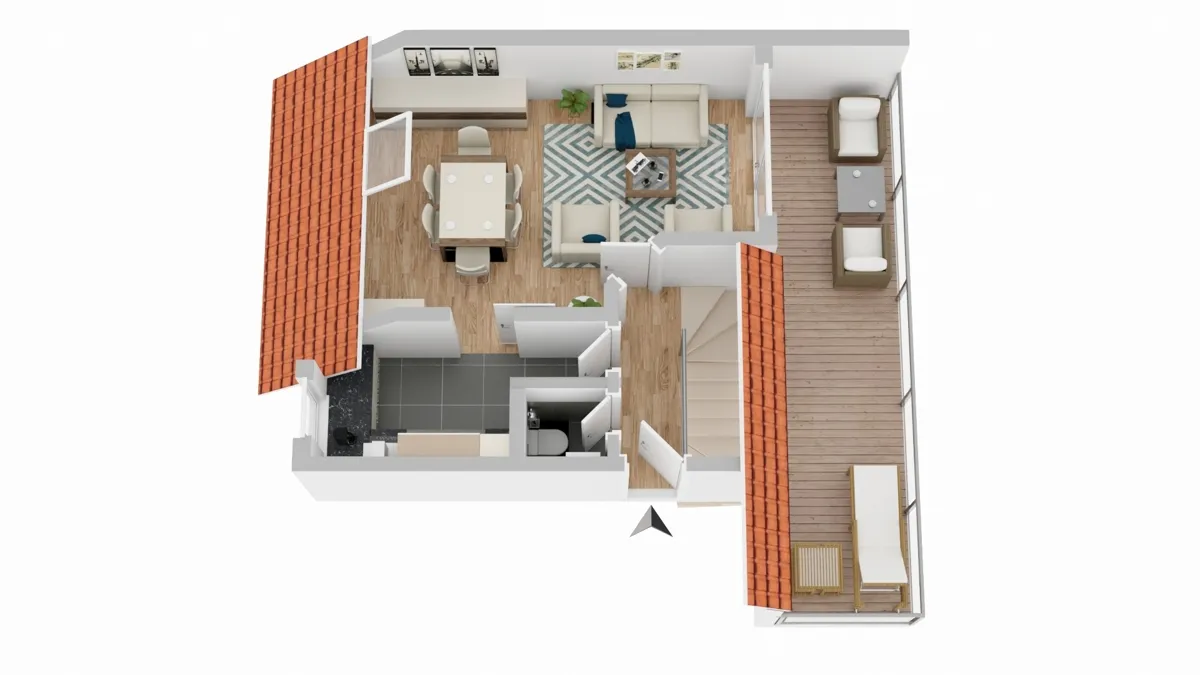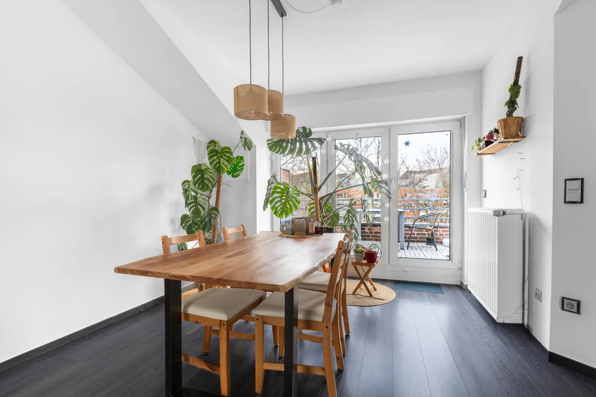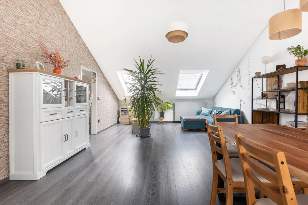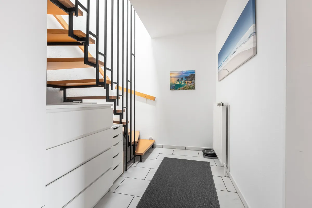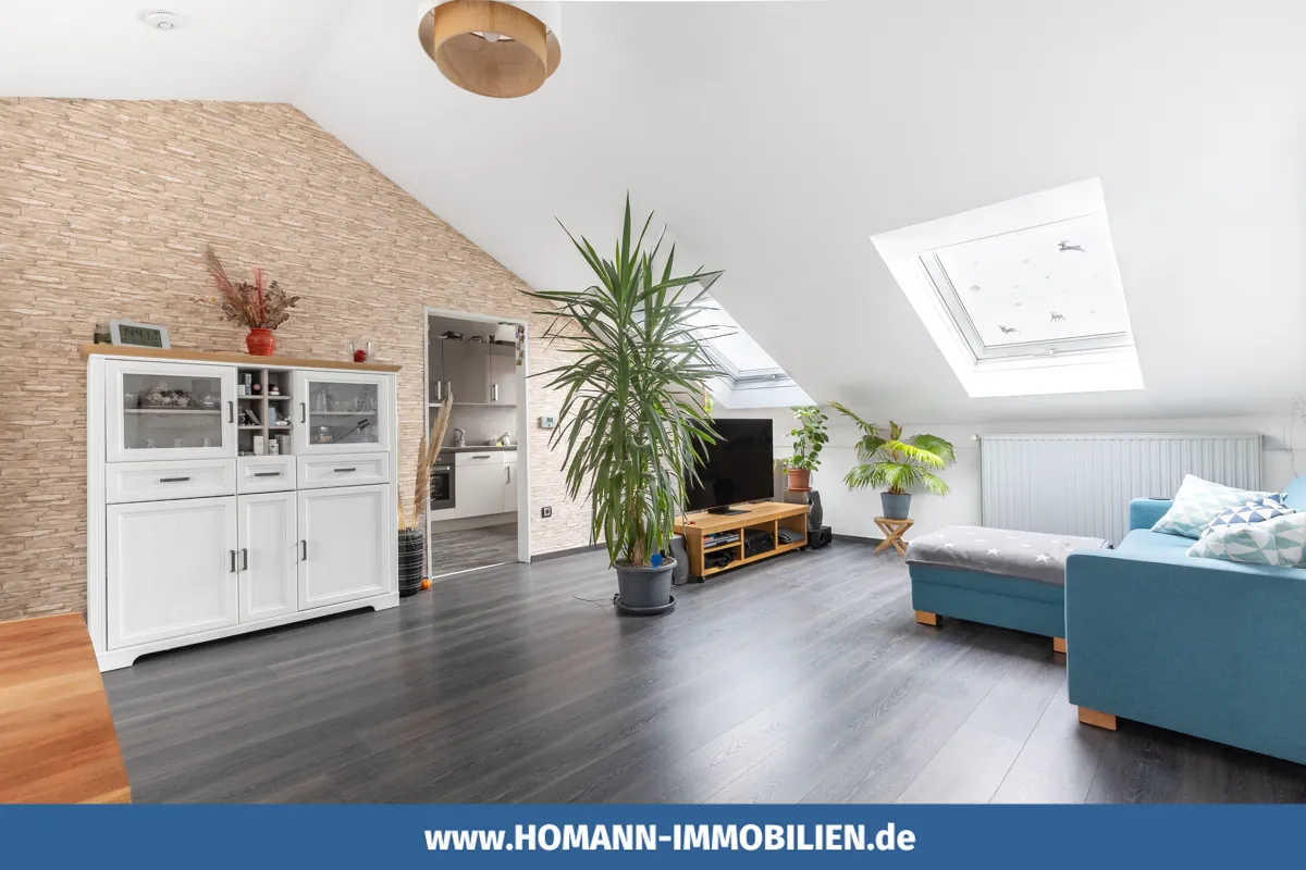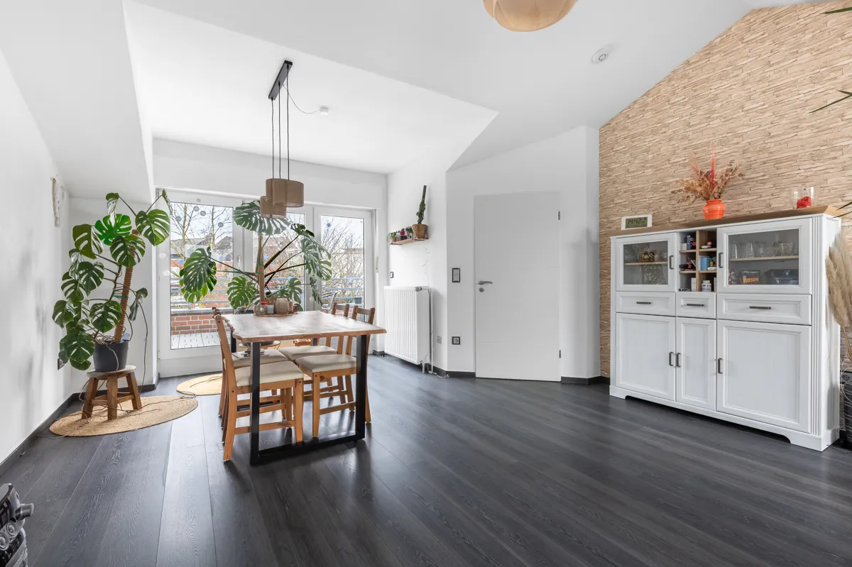 Auf der oberen Wohnebene (2. OG) befindet sich der zentrale Lebensmittelpunkt: ein heller Wohnbereich mit angenehmer Raumwirkung, die Küche sowie ein Gäste-WC. Ein besonderes Highlight ist der außergewöhnlich großzügige Balkon mit ca. 23 m² Fläche, der mit modernen Klickfliesen in Holzoptik ausgestattet ist und viel Platz für Erholung, Gestaltung und geselliges Beisammensein bietet.