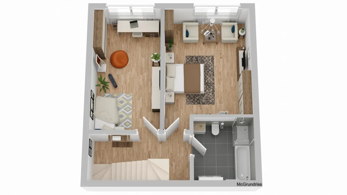 Über die interne Treppe gelangt man auf die untere Ebene (1. OG), die als privater Rückzugsbereich dient. Hier liegen zwei geräumige Schlafzimmer sowie ein großes Badezimmer, die ideale Bedingungen für komfortables Wohnen schaffen.