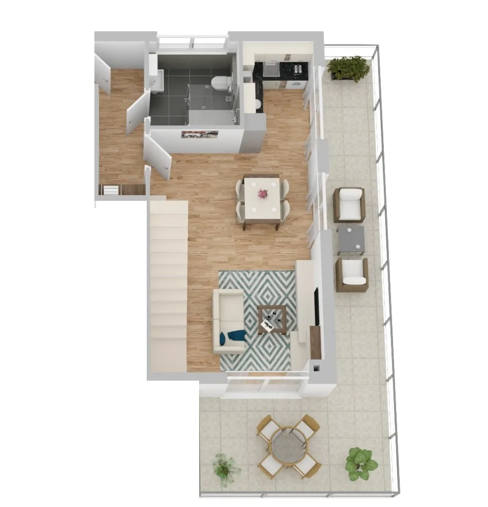 Mit einer großzügigen Wohnfläche von 74,17 m² bietet die Wohnung ausreichend Platz für vielfältige Lebenssituationen. Im Herzen der Wohnung befindet sich das lichtdurchflutete Wohn- und Esszimmer mit offener Küche. Von hier aus haben Sie direkten Zugang zu einer einladenden südwestlichen Dachterrasse, die sich perfekt zum Entspannen eignet. Hinzu kommt ein großzügiges Badezimmer mit Tageslicht, WC und ebenerdiger Dusche auf dieser Etage.