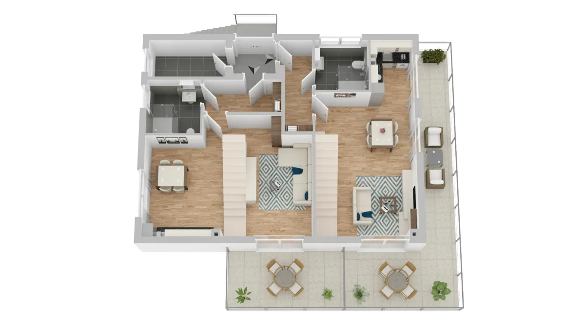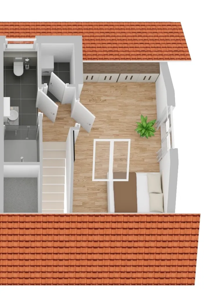Über eine elegante Holztreppe gelangen Sie ins Dachgeschoss-Studio, das ein geräumiges Schlafzimmer, einen praktischen Abstellraum und ein weiteres Bad mit ebenerdiger Dusche und WC beherbergt.