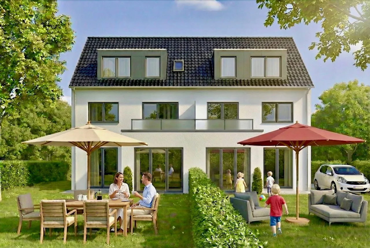 Die moderne Architektur, die klare Raumaufteilung und die energetische Ausstattung prägen das Haus. Es wird als Effizienzhaus 55 errichtet und erhält eine Luftwasserwärmepumpe sowie eine Fußbodenheizung in allen Etagen. Zwei Stellplätze, ein Teilkeller und ein kompakt geschnittenes Gartengrundstück ergänzen das Angebot. Die 2,13 m hohen Zimmertüren setzen in allen Etagen einen besonderen gestalterischen Akzent.