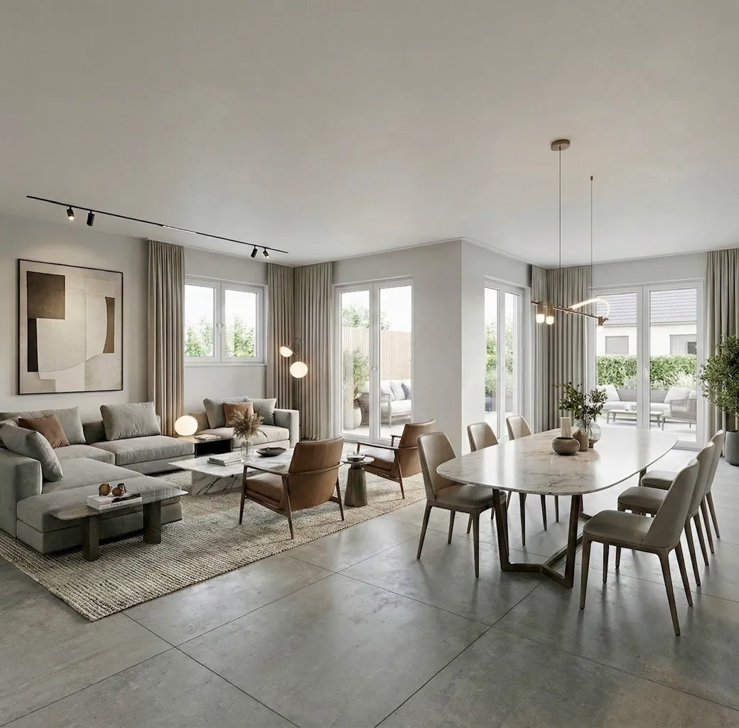Im Erdgeschoss führt der Eingangsbereich über den Flur mit Garderobe und Gäste WC in den offen gestalteten Wohnbereich. Die Verbindung aus Küche, Essen und Wohnen umfasst 53,8 m² und öffnet sich zur Terrasse sowie zum Garten mit Nordwestausrichtung. Der Boden im Erdgeschoss wird als Fliesenbelag ausgeführt.
