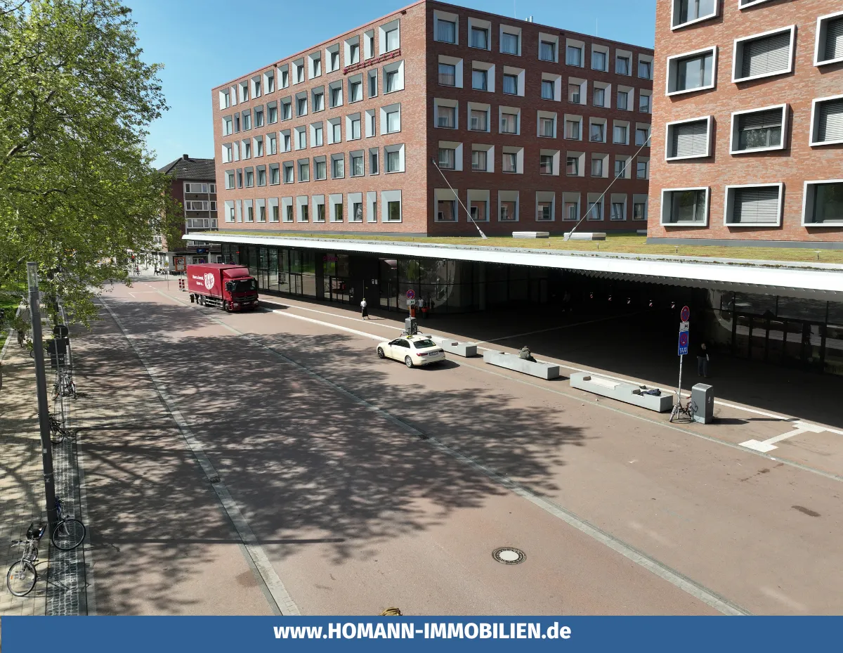 Der Münsteraner Hauptbahnhof inmitten der Stadt gelegen ist ein Knotenpunkt für regionale und überregionale Zugverbindungen (ICE- und IC-Strecken) sowie für den öffentlichen Nahverkehr und garantiert dadurch eine hohe Passantenfrequenz durch Reisende, Pendler und auch Einwohner der Stadt.