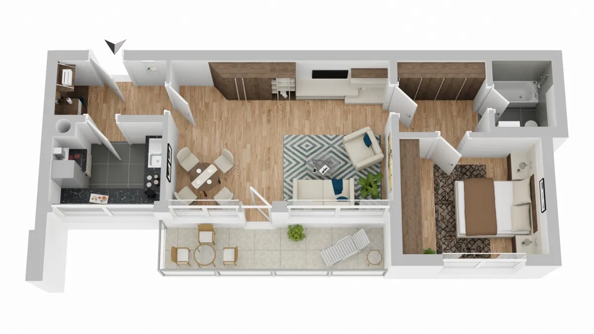 Der funktionale Eingangsbereich führt in das helle, großzügige Wohnzimmer mit großer Fensterfront und Zugang zur gemütlichen Loggia – ein geschützter Freisitz für jede Jahreszeit. Die separate Küche bietet ausreichend Platz und ist harmonisch ins Wohnkonzept integriert. Das Tageslichtbad verfügt über eine Badewanne, das Schlafzimmer bietet Ruhe und einen schönen Blick in die Grünanlage.