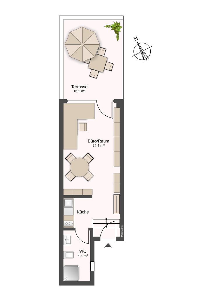 Der helle Wohn- und Schlafbereich ist mit einer Küche ausgestattet und lässt sich flexibel möblieren. Ein besonderes Highlight ist die großzügige Terrasse, die zusätzlichen Wohnkomfort bietet und zum Verweilen im Freien einlädt.