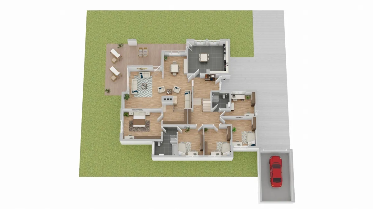 Herzstück des Hauses ist der großzügige, offen gestaltete Wohn-Ess-Kamin-Dielenbereich, der durch seine Weitläufigkeit und Transparenz ein repräsentatives Wohnambiente schafft. Die elegante Split-Level-Bauweise verleiht dem Haus architektonische Spannung und ermöglicht eine harmonische Trennung von Wohnen, Arbeiten und Rückzug.