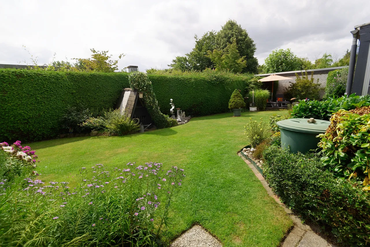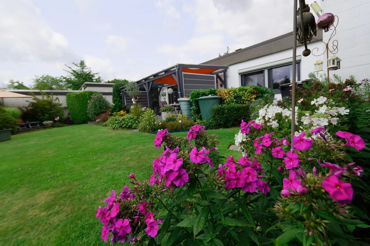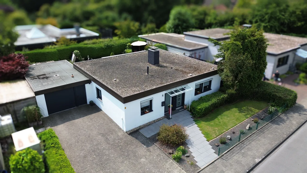 In einem ruhigen Wohngebiet erwartet Sie der stilvolle Bungalow mit angebauter massiver Garage (Sektionaltor, Zugang zum Garten).