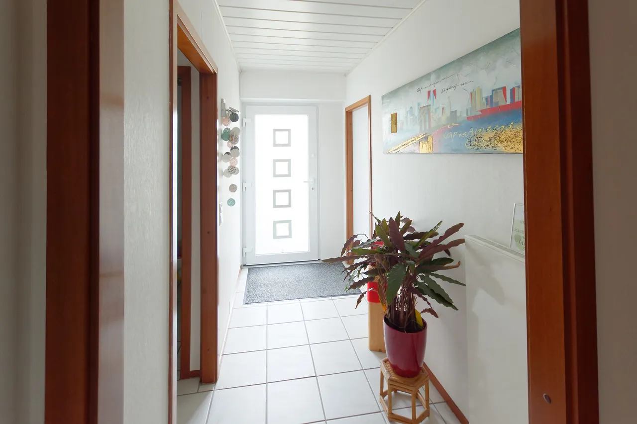 Durch die einladende Eingangstür betreten Sie den Flur, von dem Sie den Heizungsraum und das Gäste-WC erreichen. Angrenzend an den Flur folgt die Diele, hier finden Sie genügend Platz für Ihre Garderobe. Von der Diele erreichen Sie alle 3 Schlafräume sowie das moderne, freundliche Badezimmer mit ebenerdiger Glasdusche.