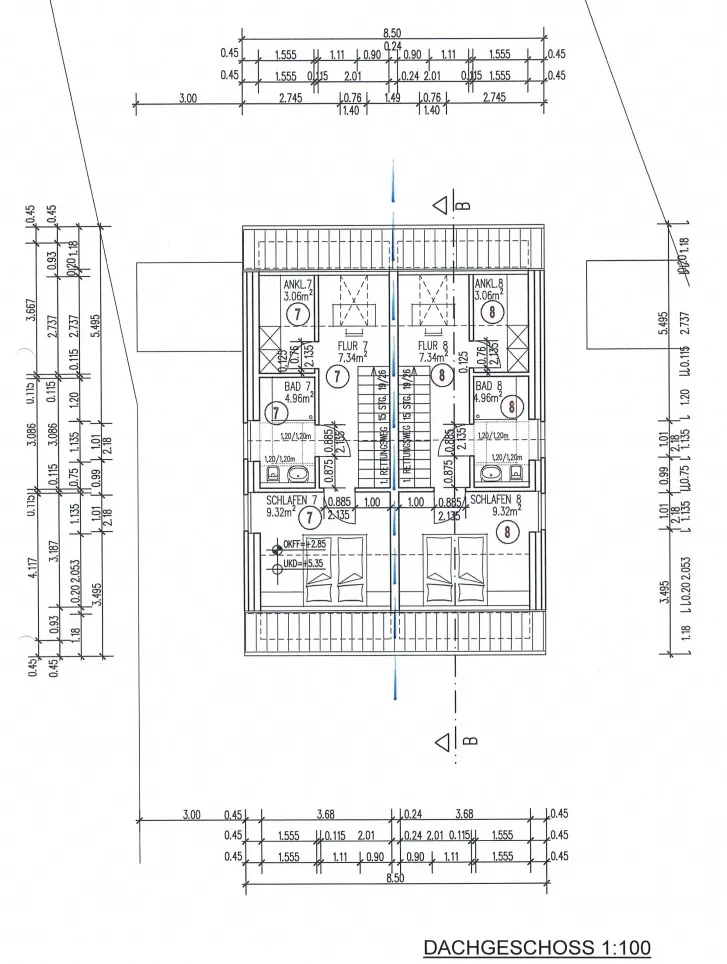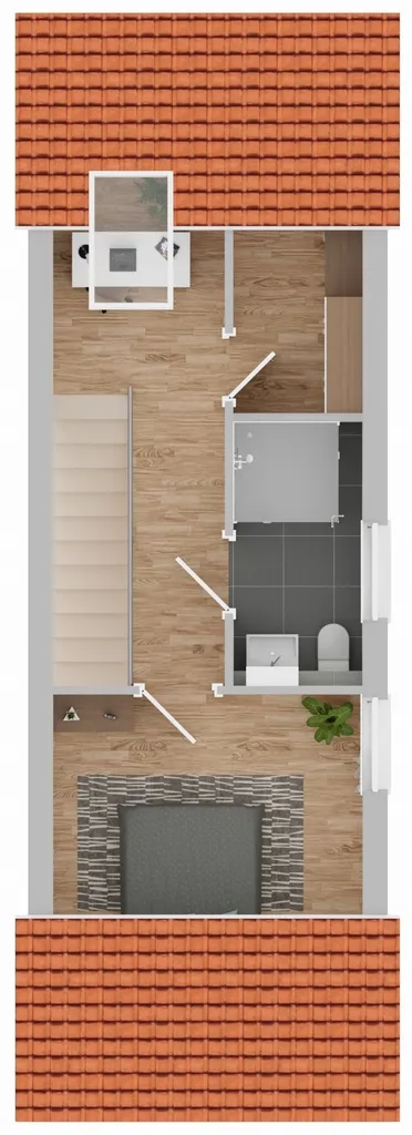 Im Obergeschoss befindet sich der private Bereich der Wohnung. Das Schlafzimmer mit angrenzender Ankleide bietet eine klare Trennung von Wohnen und Ruhen und sorgt für ein aufgeräumtes Raumgefühl. Das modern geplante Badezimmer verfügt über ausreichend Platz für eine komfortable Ausstattung.