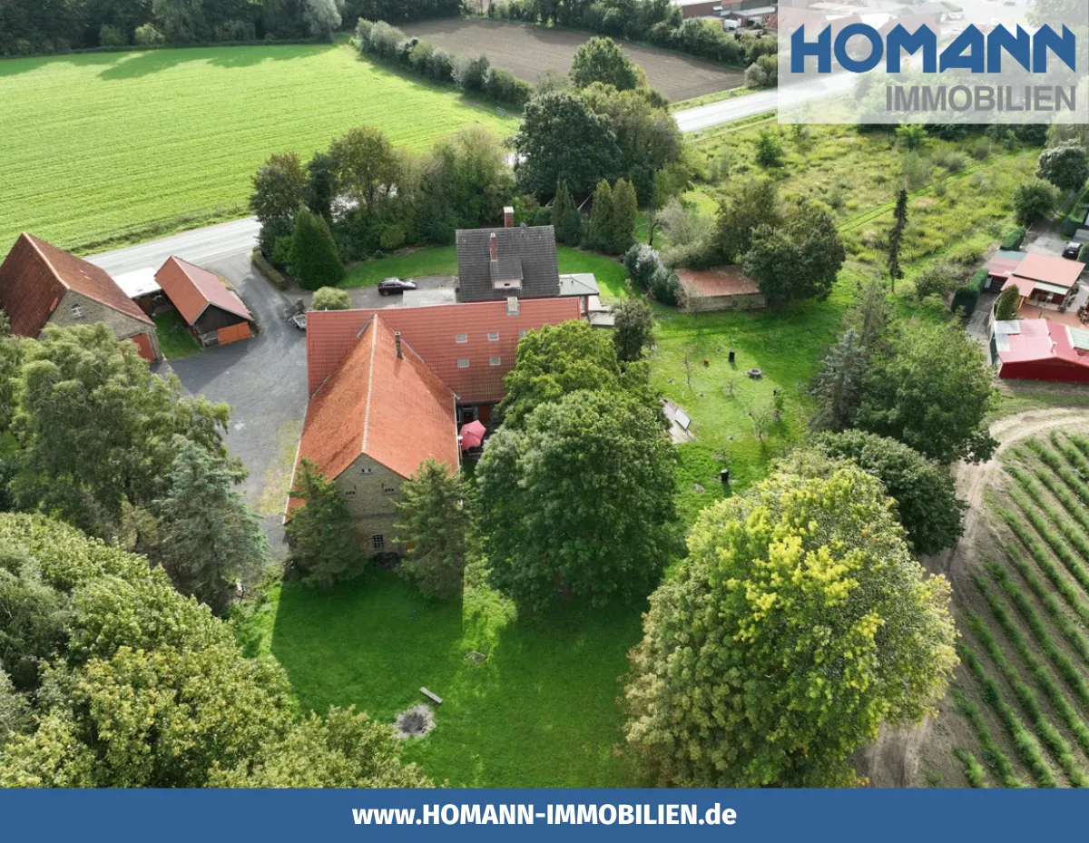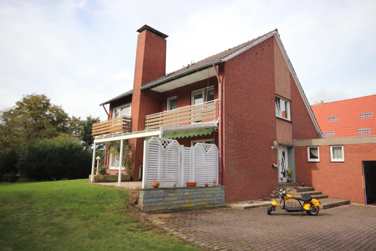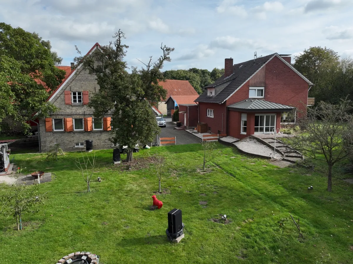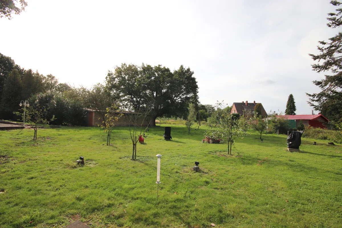 Das Grundstück verfügt über ausreichende Parkmöglichkeiten für eine Vielzahl von Fahrzeugen, einschließlich größerer Modelle, die mühelos Platz finden. Der Resthof datiert aus dem Jahr 1895, während das Wohnhaus im Jahr 1965 erbaut wurde.