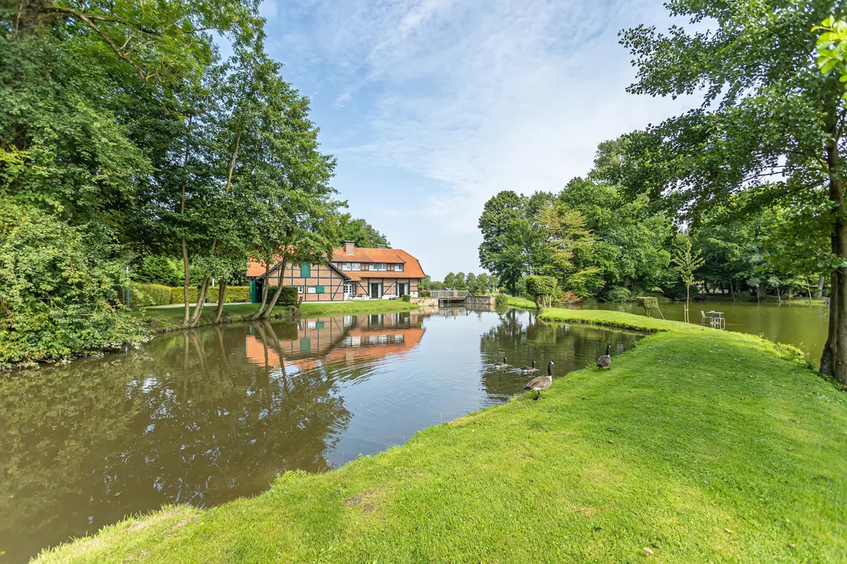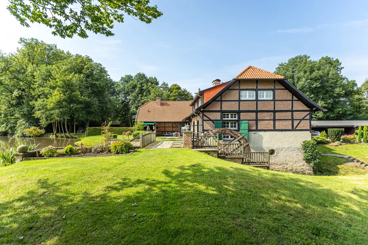 Es handelt es sich bei dieser einzigartigen Immobilie um die historische Wassermühle vom Schloss Nordkirchen. Das Privatanwesen ist in die münsterländische Parklandschaft eingebettet und erstreckt sich auf einer idyllischen Wald- Wasser- und Weidenfläche von