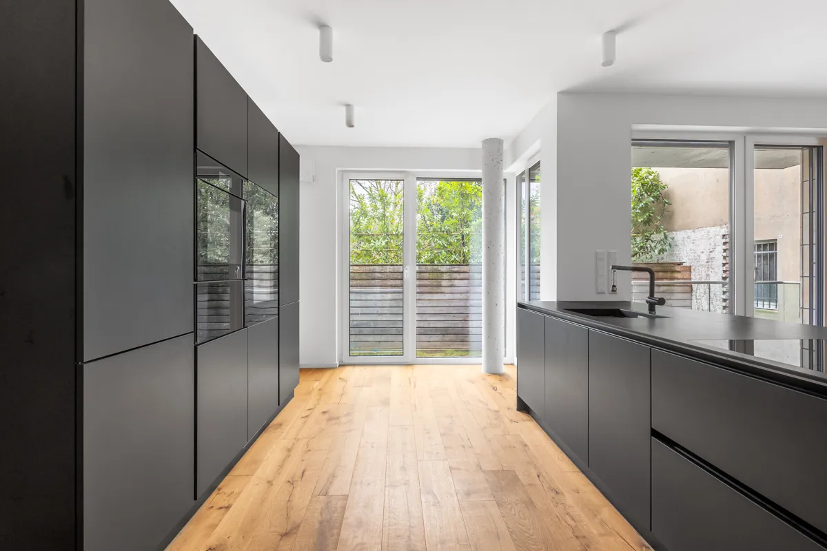 Das Erdgeschoss überzeugt durch sein offenes, lichtdurchflutetes Raumkonzept. Vom großzügigen Entrée gelangen Sie direkt in den weitläufigen Wohn- und Essbereich, der nahtlos in die hochwertig ausgestattete Küche übergeht. Ein Gäste-WC sowie eine praktische Garderobe ergänzen das Raumangebot auf dieser Ebene. Die private Gartenterrasse mit gemütlicher Loggia lädt zu entspannten Stunden im Freien ein – ideal für Genussmomente mitten in der Stadt.
