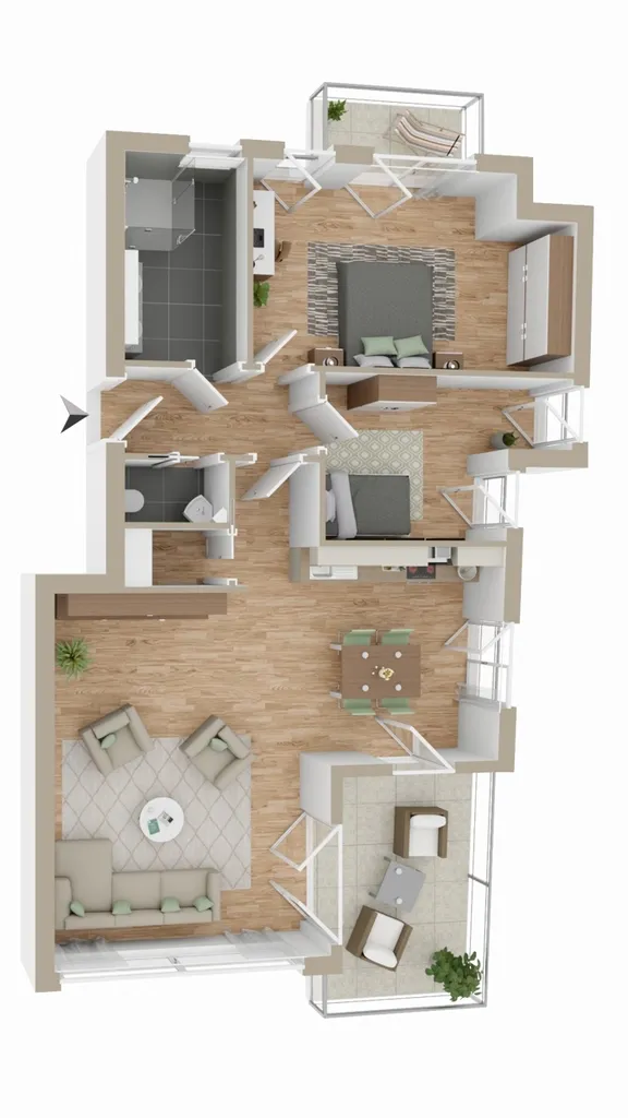 Ein stilvolles Tageslichtbad mit bodengleicher Dusche bietet höchsten Komfort und ist ebenso durchdacht wie das separate Gäste-WC, das ebenfalls über ein Fenster verfügt. Zwei gut proportionierte Zimmer eignen sich flexibel als Schlafzimmer, Arbeits- oder Gästezimmer. Die hochwertige Innenausstattung mit edlen Bodenbelägen, moderner Technik sowie einer angenehmen Fußbodenheizung fügt sich harmonisch in das Gesamtkonzept ein. Dank vorbereiteter Smart-Home-Technologie lässt sich die Wohnung zudem ganz individuell auf Ihre Bedürfnisse anpassen.