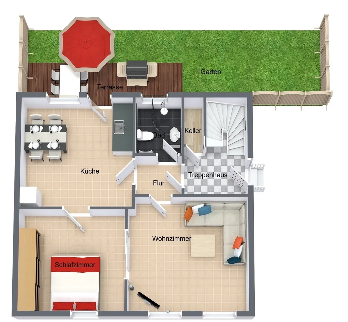 Wohnung 1: Die Erdgeschosswohnung besteht aus 2 Zimmern, Küche, Bad und misst ca. 50 m². Zu der Wohnung gehört der schöne Garten, der von der Wohnung einen direkten Zugang hat, und ein Kellerraum.