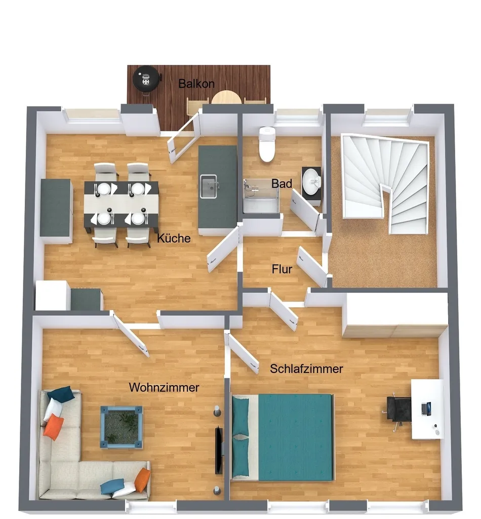 Wohnung 2: Im 1. Obergeschoss sind auch 2 Zimmer, Küche, Bad und ein Balkon, der nach Süden ausgerichtet ist. Die Wohnung misst ca. 50 m² und verfügt über einen Kellerraum.