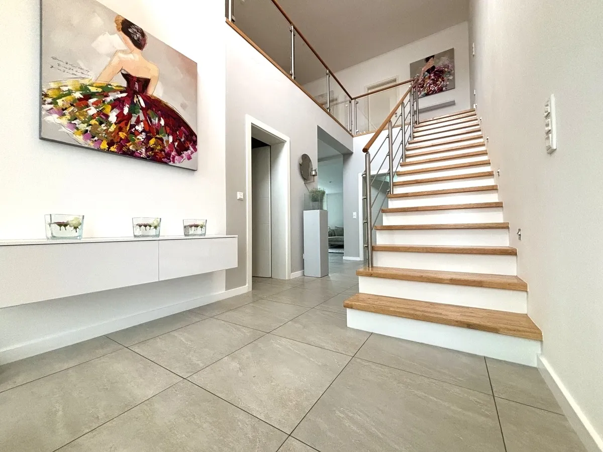 Bereits beim Betreten empfängt Sie ein imposanter Eingangsbereich mit einer Deckenhöhe von fast sechs Metern. Hier verschmelzen Licht, Weite und klare Linien zu einem beeindruckenden Empfang, der zugleich Offenheit und Behaglichkeit ausstrahlt.