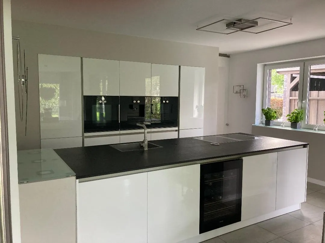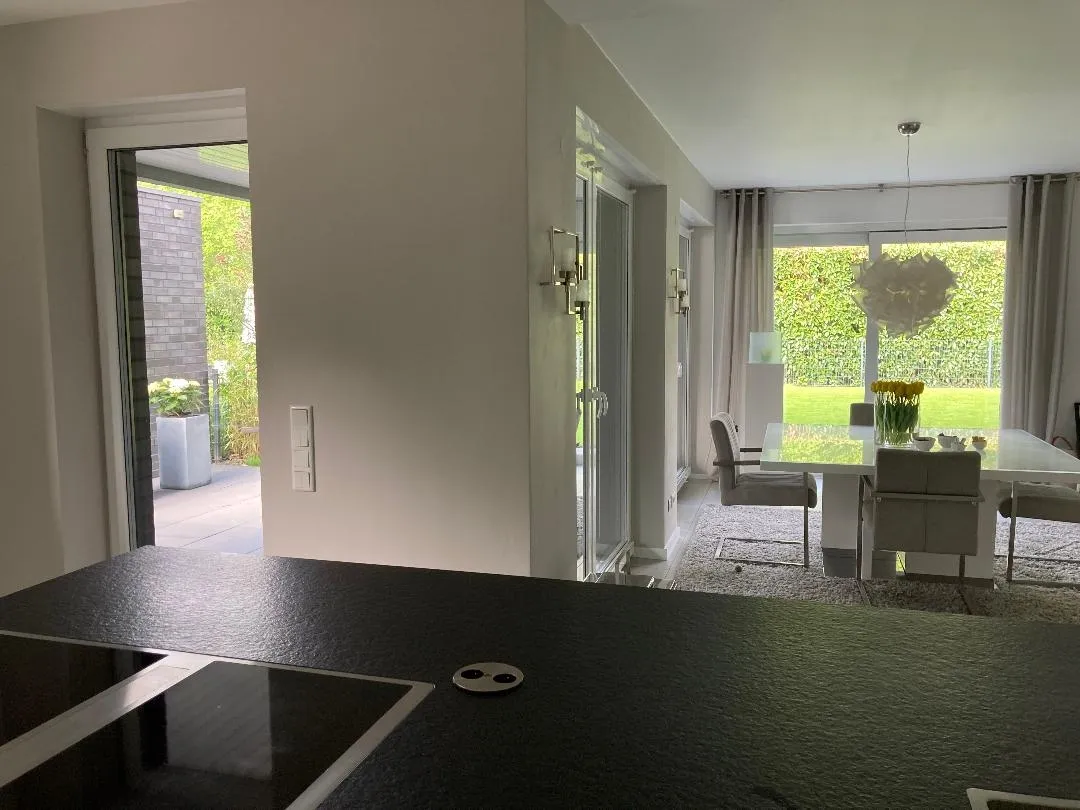 Der Mittelpunkt des Hauses ist der weitläufige Wohn- und Essbereich. Großzügige Glasfronten lassen die Grenzen zwischen Innen- und Außenraum nahezu verschwinden und schaffen einen fließenden Übergang zu Garten, Lounge und Sonnenterrasse. Die offene Luxusküche mit Geräten von Gaggenau und integriertem Weinklimaschrank macht diesen Bereich zum Treffpunkt für Familie und Freunde – ideal für stilvolle Abende ebenso wie für den Alltag. Die Küche erhöht den Kaufpreis um 45.000€ auf 1.043.00€. Direkt hinter der Küche befindet sich ein großzügiger Hauswirtschaftsraum, der zusätzlichen Stauraum und Funktionalität bietet. Ein weiterer Hauswirtschaftsraum mit integrierter Waschküche liegt unmittelbar neben der 9 Meter langen und über 3 Meter hohen Garage und ist von dort aus direkt zugängig.