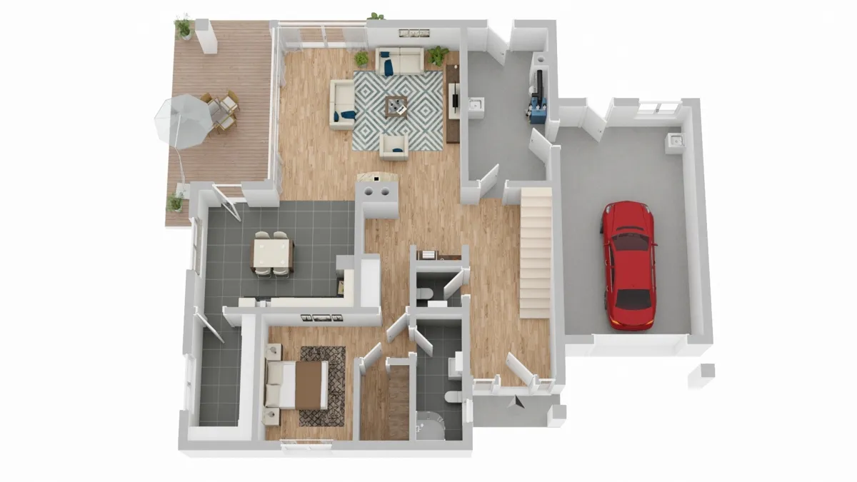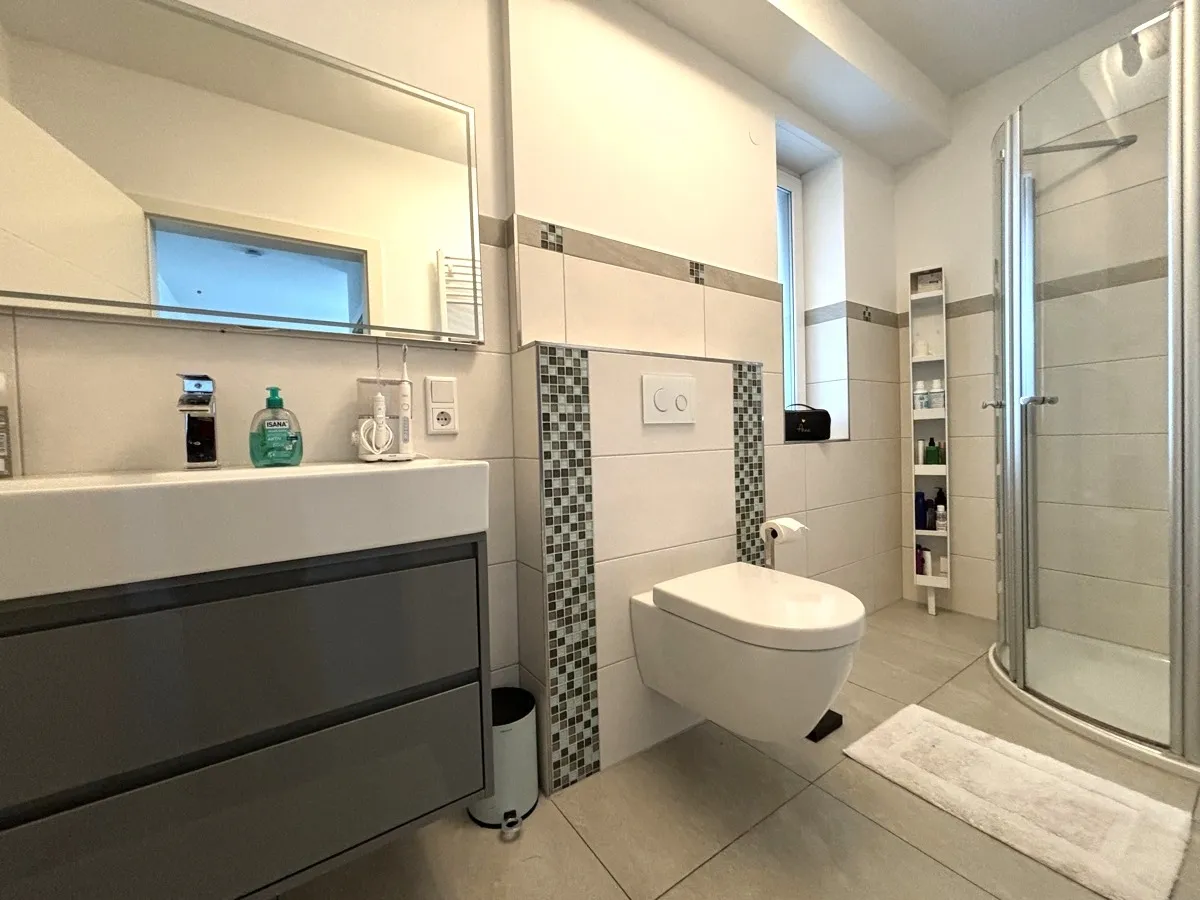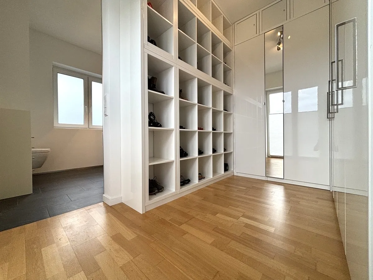 Im Erdgeschoss befindet sich zudem ein separater Wohnbereich mit Schlafzimmer, begehbarer Ankleide und En-suite-Duschbad. Die durchdachte Konzeption ermöglicht eine vielseitige Nutzung – sei es als komfortabler Gästebereich, als Zimmer für ein Au-pair oder auch für barrierefreies Wohnen, beispielsweise für Sie selbst, eines Ihrer Kinder oder einen Elternteil. Perspektivisch ist das Haus sogar auf eine mögliche Teilung in zwei Einheiten vorbereitet.