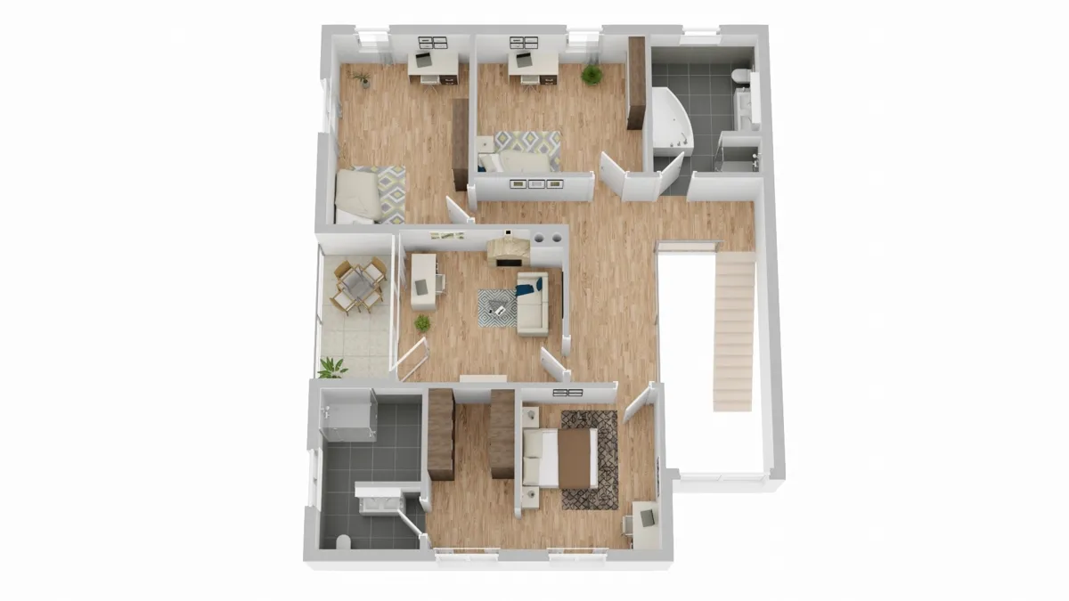 Im Obergeschoss erwarten Sie zwei helle Kinderzimmer mit eigenem Tageslichtbad sowie eine exklusive Elternsuite mit Schlafzimmer, Ankleide und angrenzendem Bad mit großzügiger, ebenerdiger Dusche.