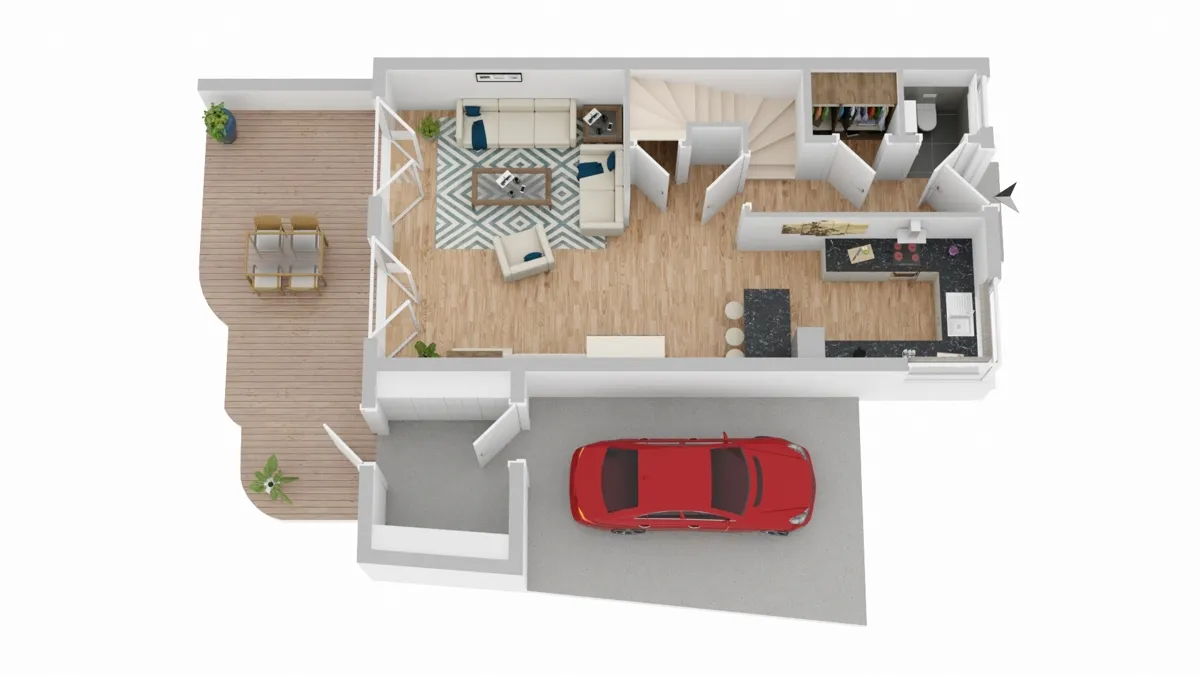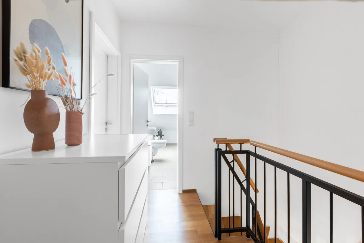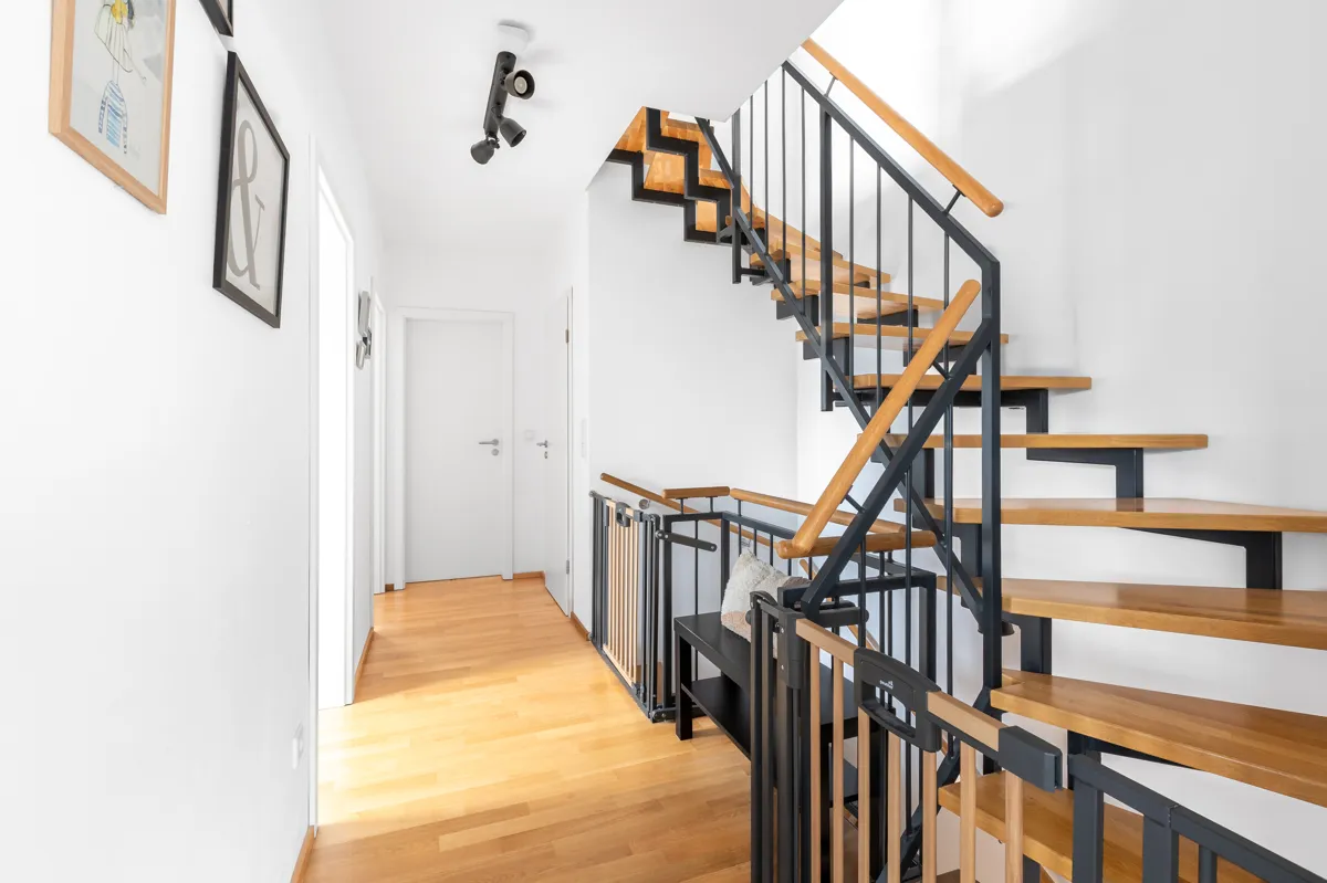Hochwertige Materialien, dreifach verglaste Fenster, elektrische Rollläden, eine einbruchsichere Haustür sowie stilvolle Bodenbeläge unterstreichen den modernen Charakter des Hauses. Eine moderne Einbauküche und mehrere Bäder, darunter ein Gäste-WC sowie ein Bad auf jeder Wohnebene, bieten zusätzlichen Komfort im Alltag.