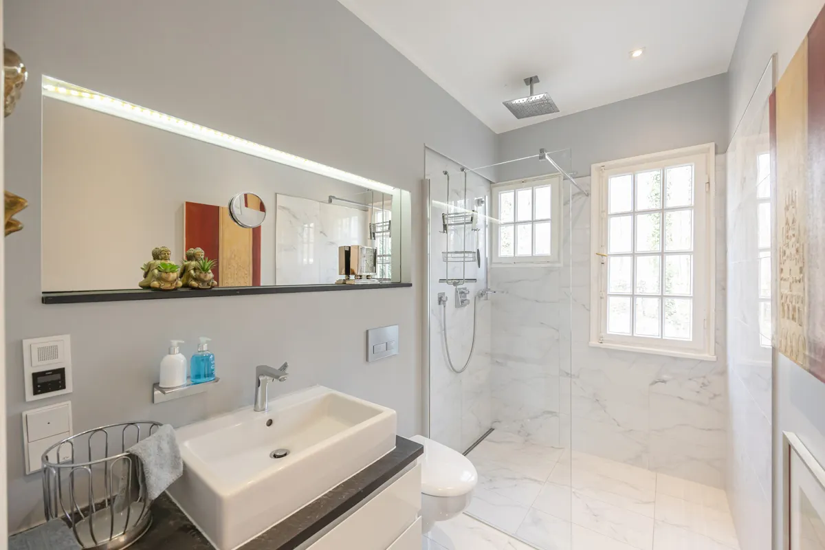Das 1945 erbaute und 2014 sanierte Haus bietet ca. 312 m² Wohnfläche, ca. 120 m² Nutzfläche sowie 7 Zimmer, darunter 3 Schlafzimmer und 3 Bäder. Großzügige Grundrisse, hohe Decken und große Fensterfronten schaffen ein repräsentatives Raumgefühl und verbinden Innen- und Außenbereiche harmonisch.