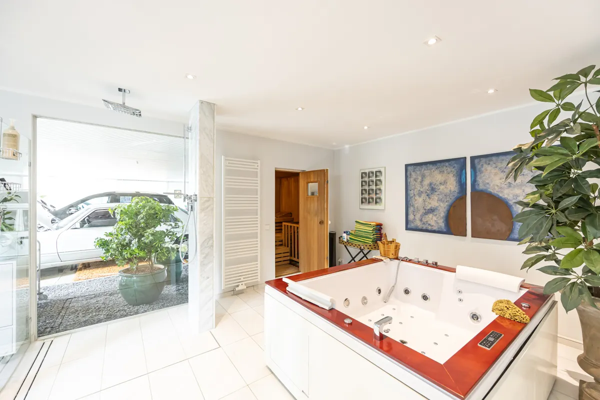 Ein privater Wellnessbereich mit Sauna, Whirlpool und Fitnessraum lädt zum Entspannen ein. Mehrere Terrassen mit Waldblick erweitern den Wohnraum ins Freie. Besonders hervorzuheben ist der separate Einliegerbereich, aktuell als Oldtimer-Ausstellung genutzt, der sich flexibel als zweite Wohneinheit, Schwimmbad oder Pferdestall gestalten lässt.
