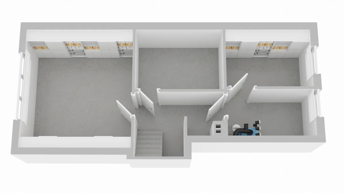 Ein Badezimmer sowie ein separates Gäste-WC sind vorhanden. Der Keller bietet zusätzlichen Stauraum und Platz für Technik, Vorräte oder eine Werkstatt.