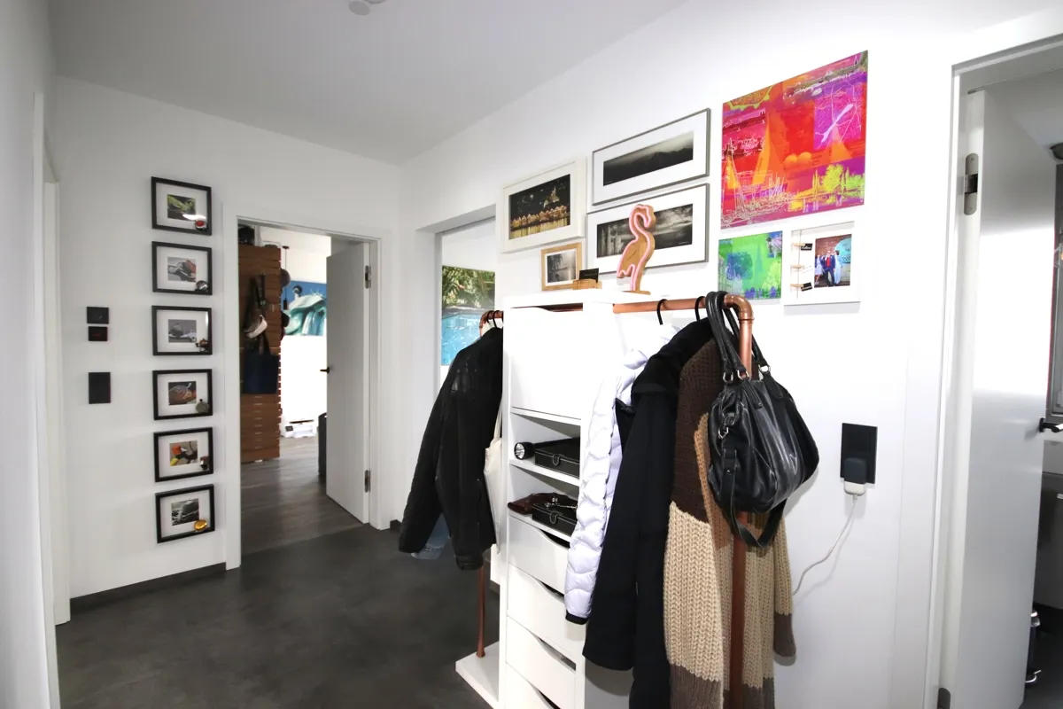 Die Wohnung beginnt mit einem Flur inklusive moderner Garderobenmöglichkeit. Hier kann man in Ruhe ankommen und alles ablegen. Von hier aus werden alle relevanten Wohnräume zentral erschlossen.