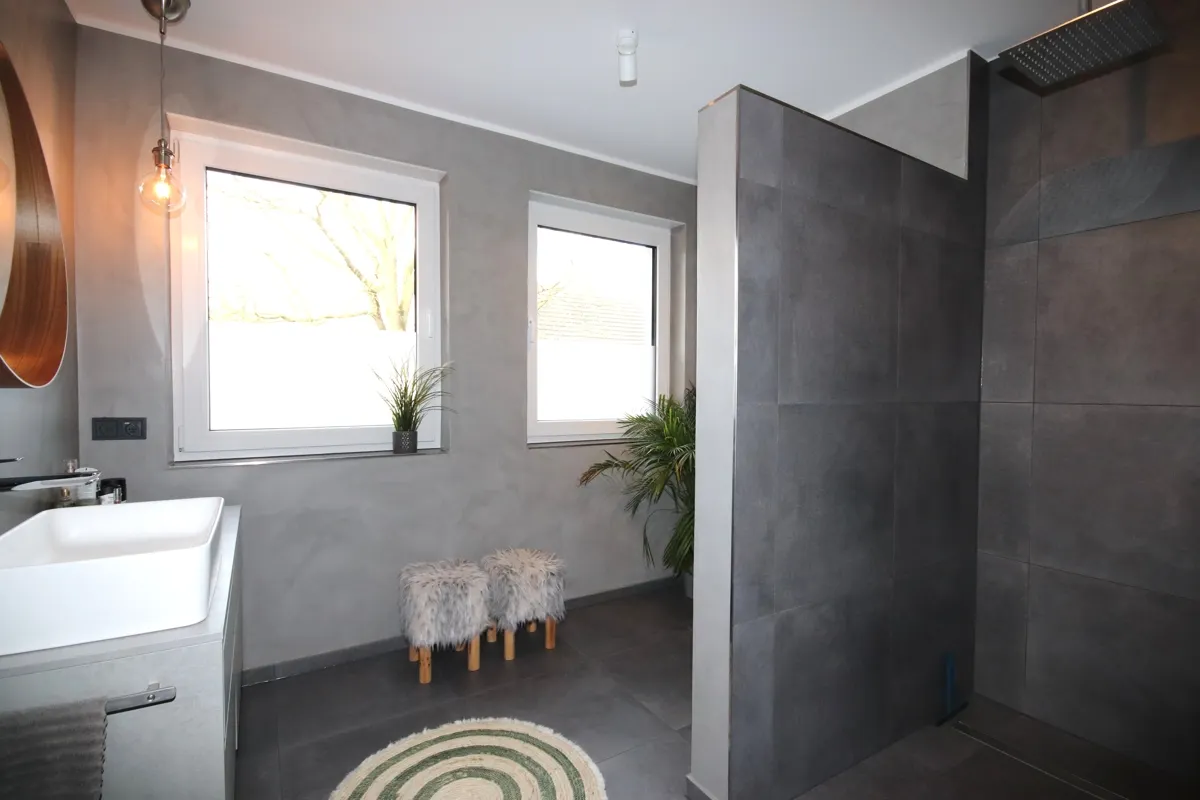 Rechter Hand befinden sich ein Gäste-WC mit zusätzlicher Dusche, ein Abstellraum sowie ein hochwertig ausgestattetes Tageslichtbad. Die Badeinrichtung ist modern und stilvoll gestaltet.